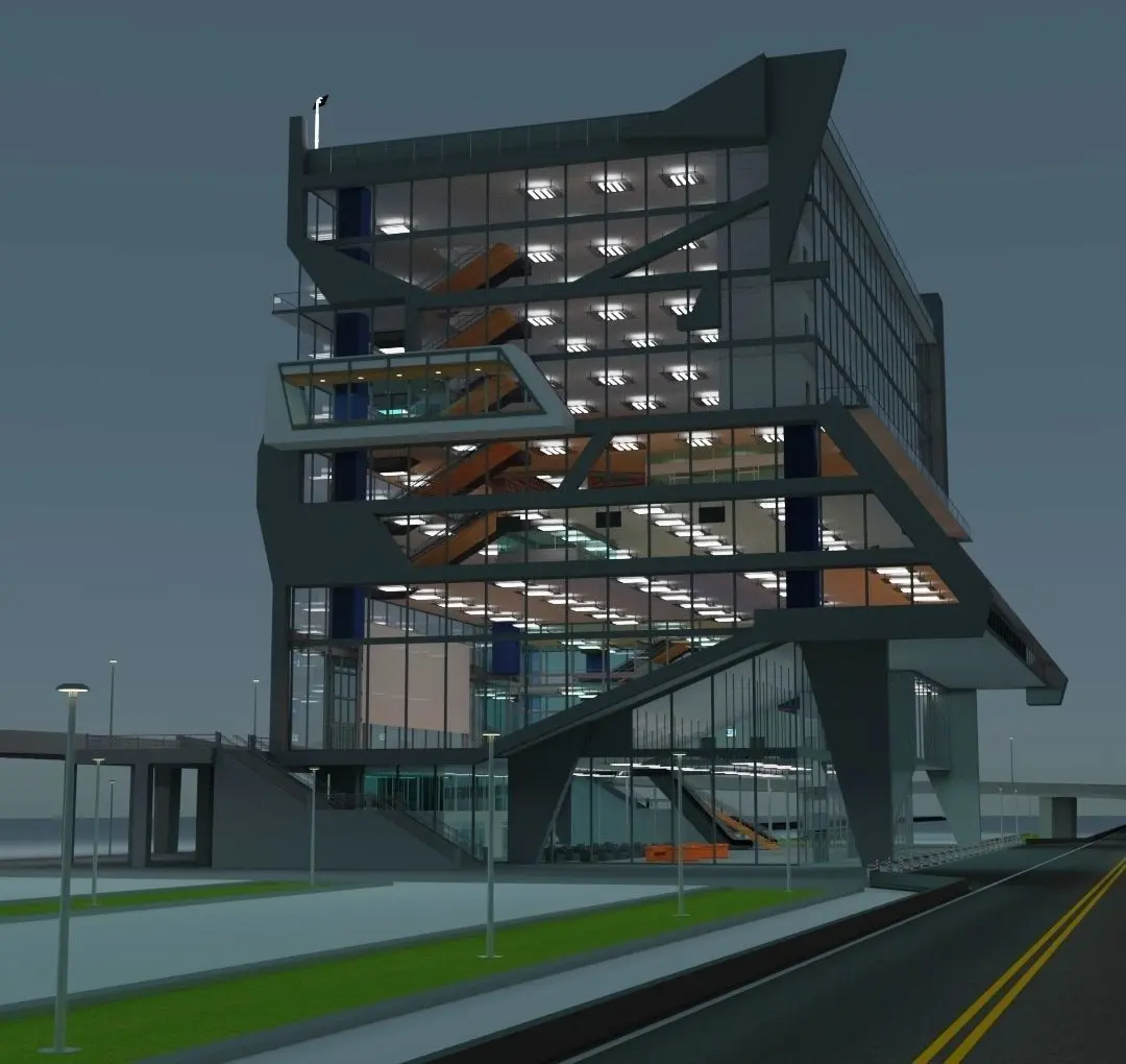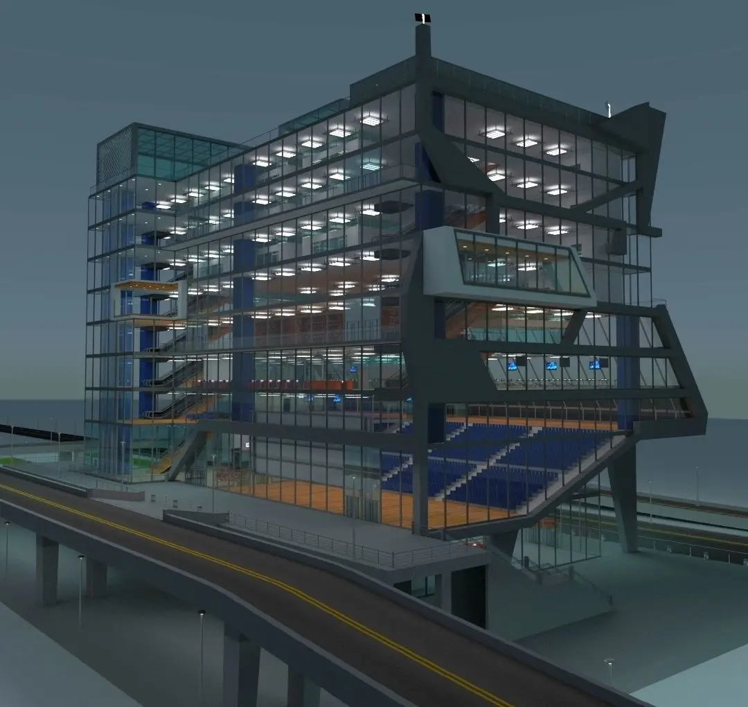 It contains gym (tapis roulant, bike, weight lifting bench) , escalators, stairs, cinema, theater, lift, library