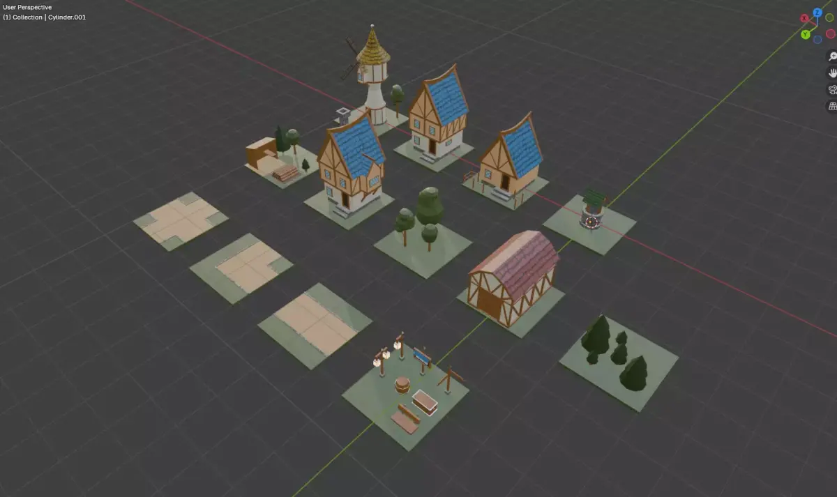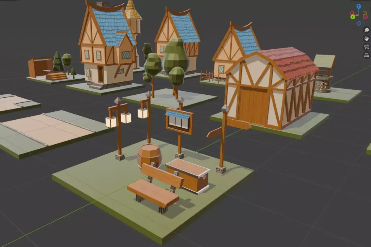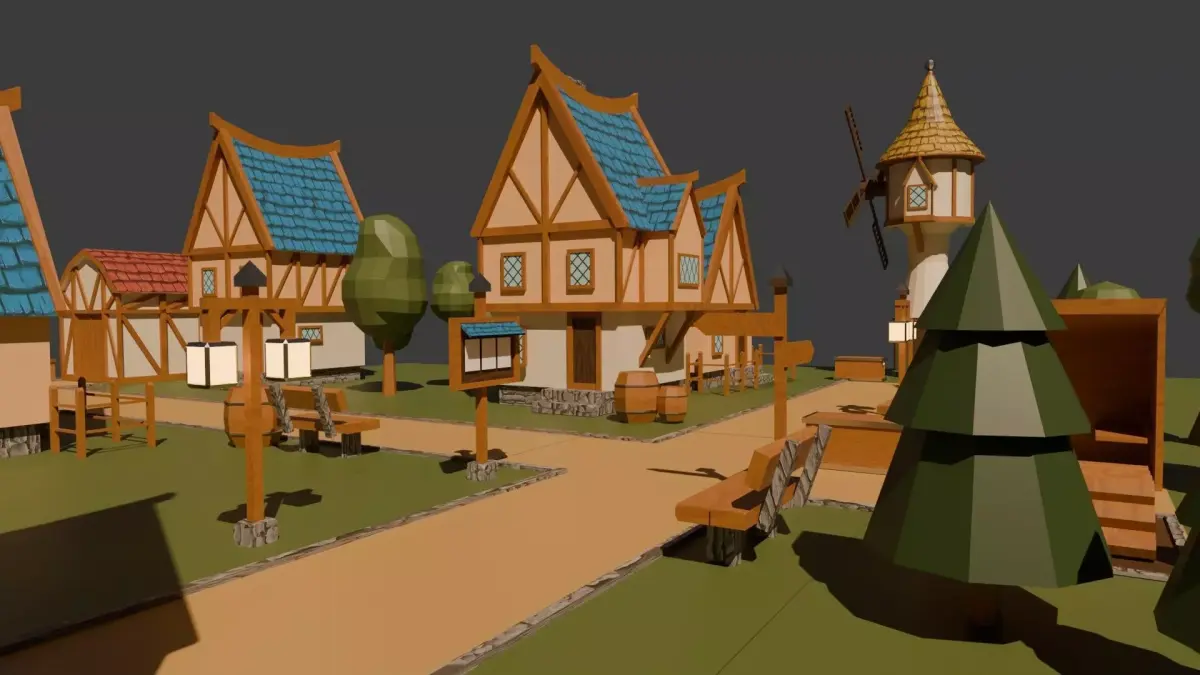 The set includes 7 buildings, 3 road variants, and 9 decorative elements, including trees. The models are low-poly and ready for game creation. The total polygon count is 10,703.Formats: .blend, .obj, .fbxGame ready