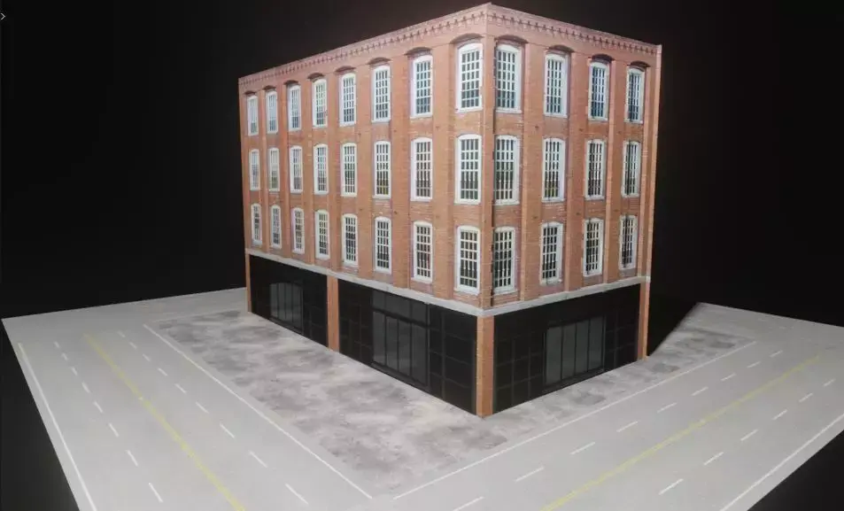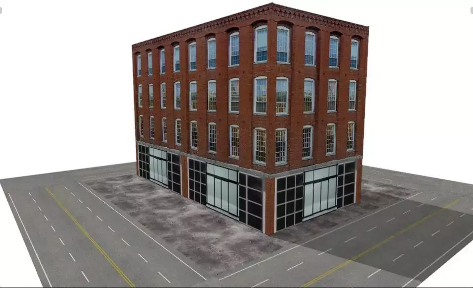 Bring realism to your projects with this versatile commercial building model that blends old-style brick architecture with modern storefronts.