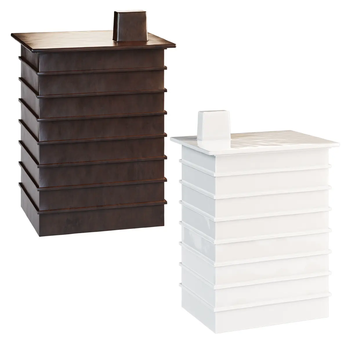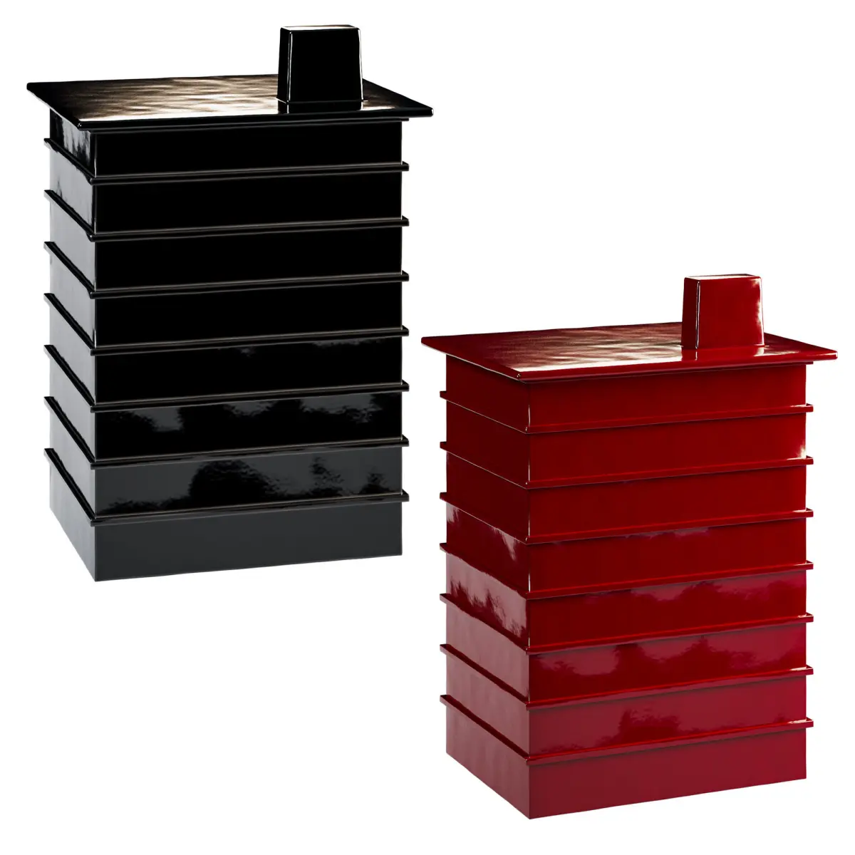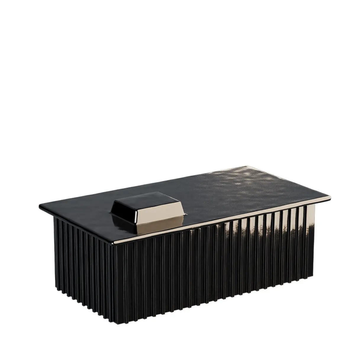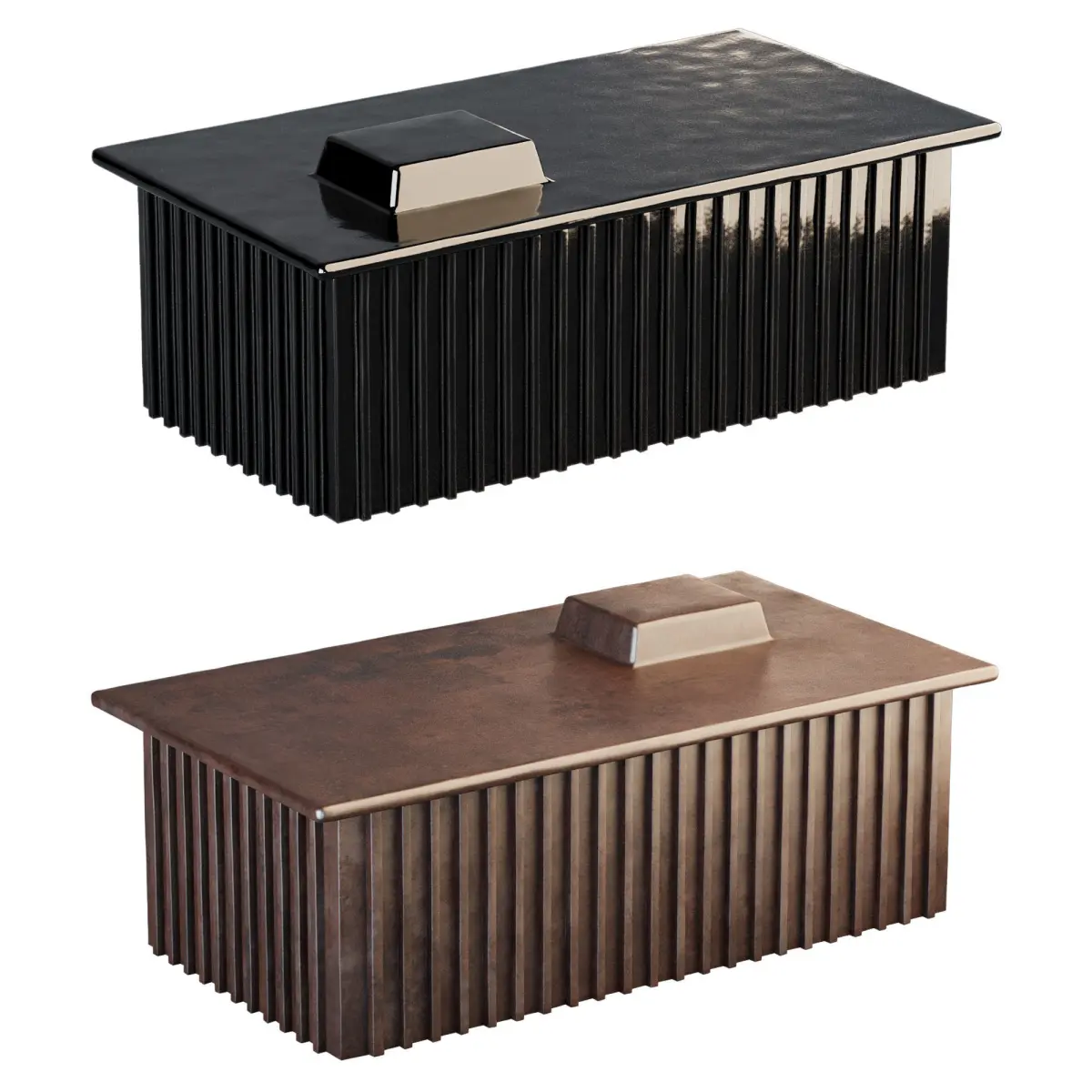 This building boxes bring to mind the industrial areas so familiar within our urban landscapes.An industrial aesthetic accentuated by the deep black, or metal brown glazed fi nish to theirceramic structures. With a stretched out footprint, its lined exterior is toped with an equallygenerous cantilevered top. Space enough to keep all your possessions under one roof.