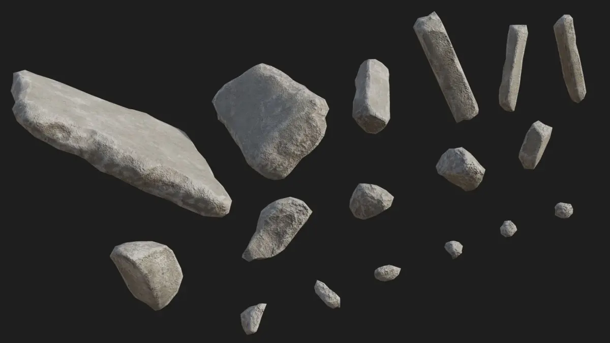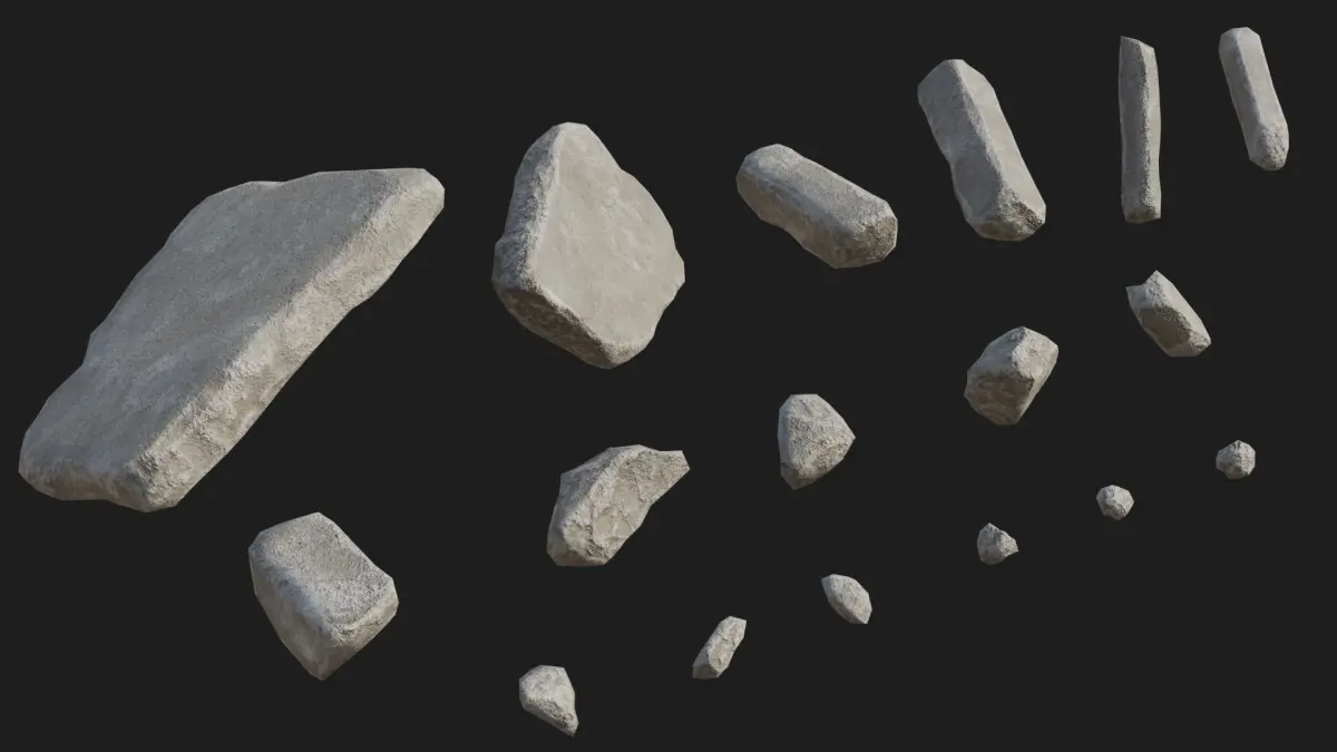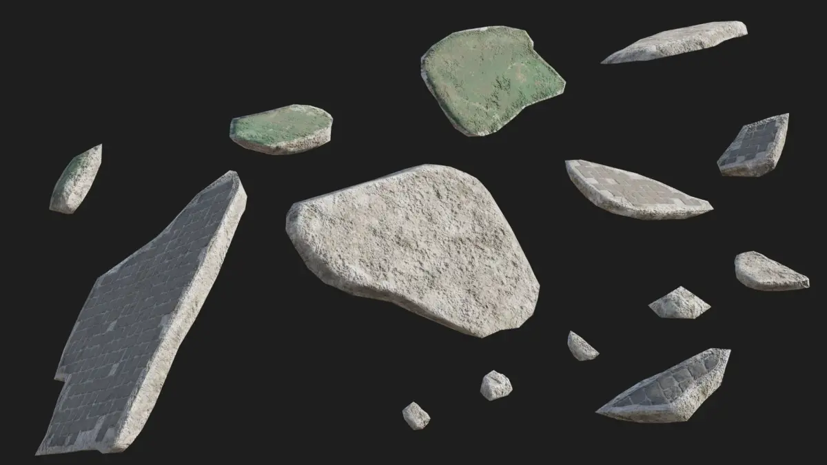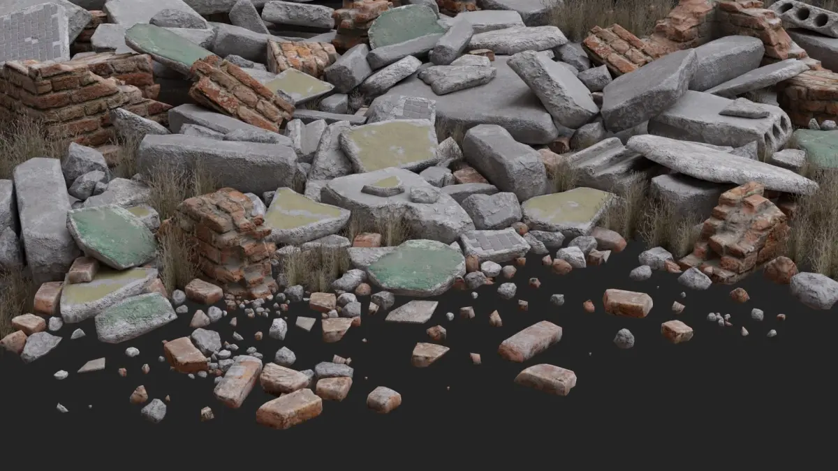 The set includes 67 destroyed building debris, such as broken concrete blocks, pieces of demolished brick walls, a concrete staircase, bricks, fragments of painted destroyed walls, and small debris. Each piece is sculpted by hand and has a unique texture. This set of destroyed debris is suitable for filling post-apocalyptic game scenes, creating videos, and renders.You can use them right away in your projects. It’s readily available to import in Unity3D and UE5.