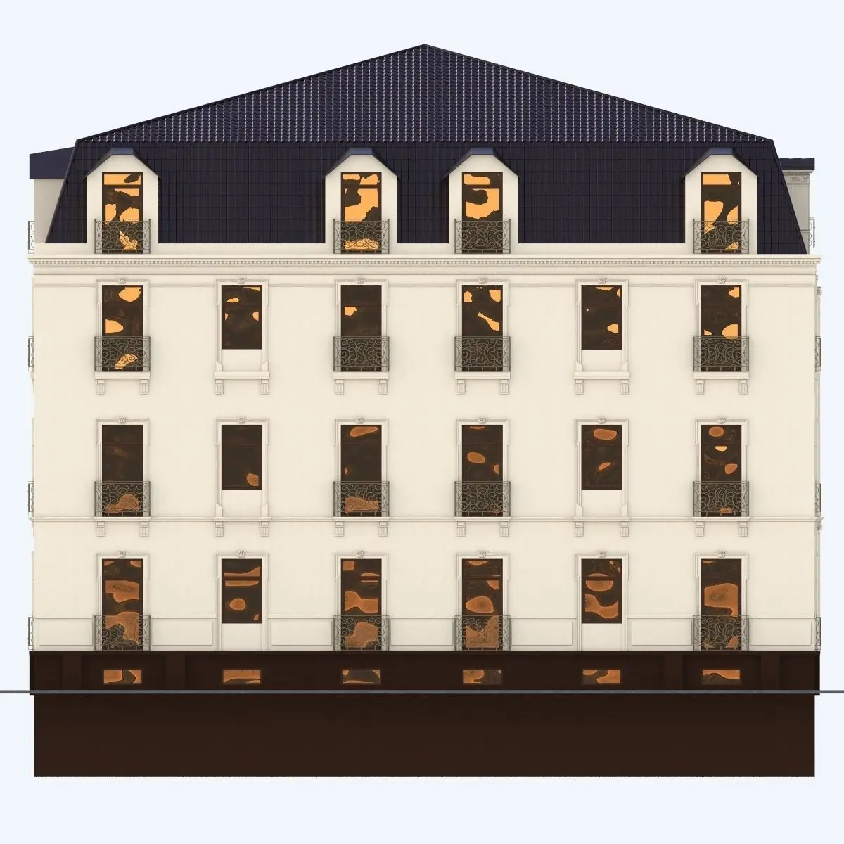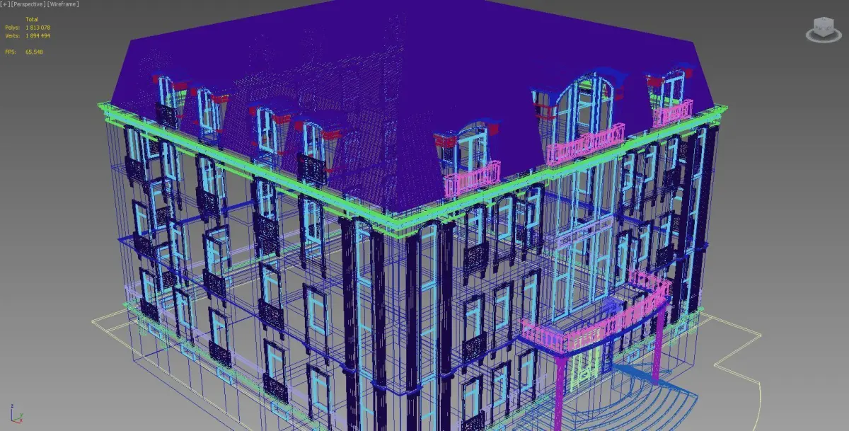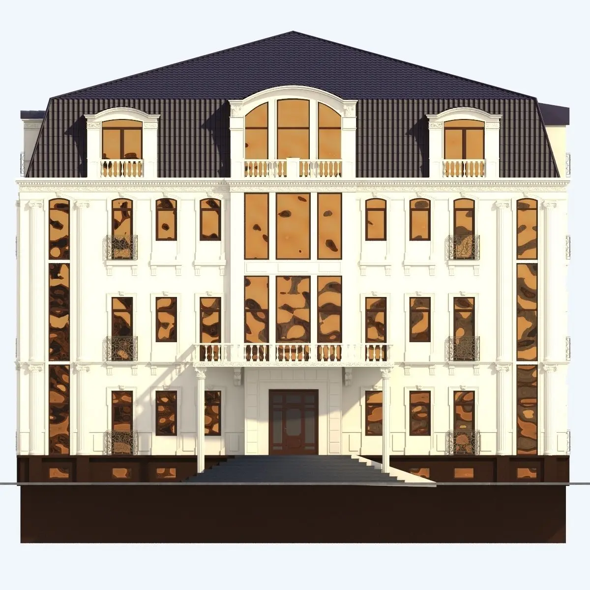 A building model is executed with the elements of the classics. The fretted details are present on a facade.