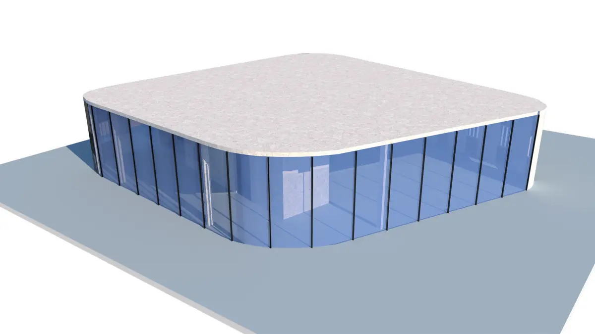 Detailed 3D model of a conference and exhibition building, created in SketchUp, designed to merge functionality and aesthetics for artistic and cultural events. With a total area of 404 m², the design optimizes the exhibition and conference space, prioritizing spaciousness and fluid visitor flow. Restrooms are centralized on an island, freeing up the perimeter for exhibition and conference rooms, while large windows ensure natural light and panoramic views of the exterior. The design includes reception and lounge areas for attendees, and flexible spaces are considered to accommodate different types of events and exhibitions. The structure and finishes have been accurately modeled for realistic visualization, allowing the building to be explored from multiple angles, facilitating project planning and presentation.