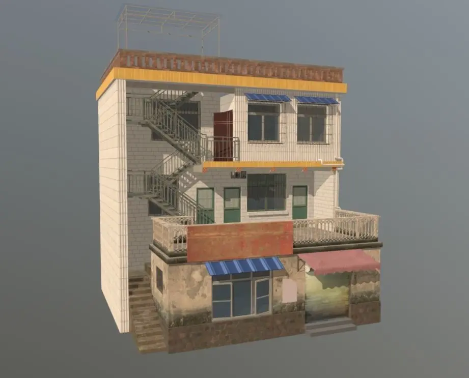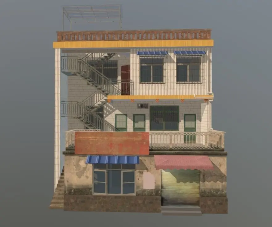 The model is made with SketchUp and PBR material flow. The whole scene is a residential area of a small town on the border