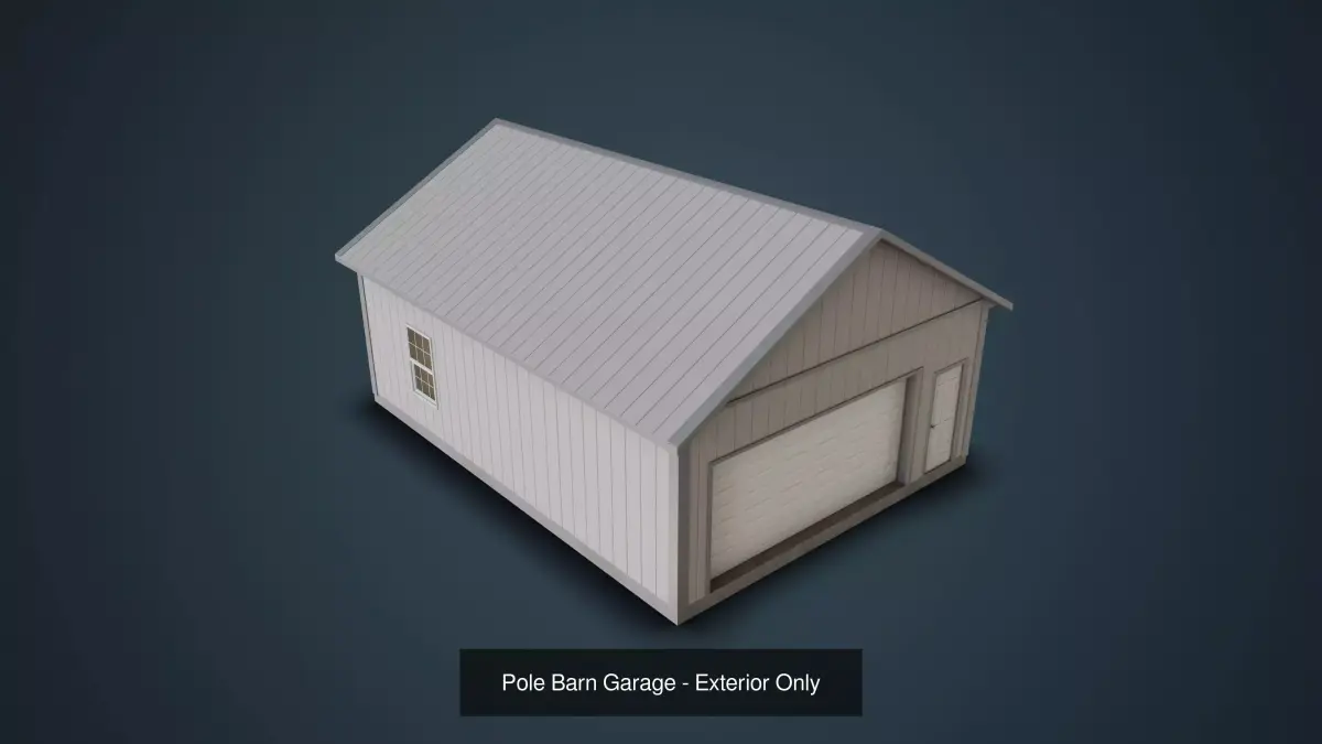 Objects(1):pole_barn_garage794.2 cm Width(X), 1037.4 cm Length(Y), 546 cm Height(Z)312.7 in Width(X), 408.4 in Length(Y), 215 in Height(Z)Polycount: 2,745Triangle count: 5,145Vertex count: 2,936