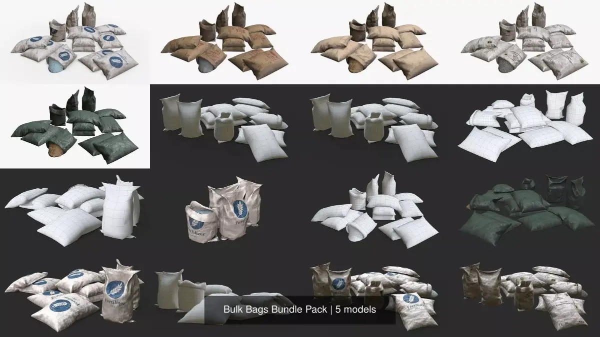 This modern bulk bags assets pack including 10 individual bag sets and 2 content sets with 3 LODs and collision boxes to get the best optimization and the best quality for the most popular game engines. All elements can easily be positioned together to create a more detailed scene. Also, this pack includes 5 pre-assembled sets to allow you to speed up your assemblies and also to inspire you on the different ways of composing the elements together.