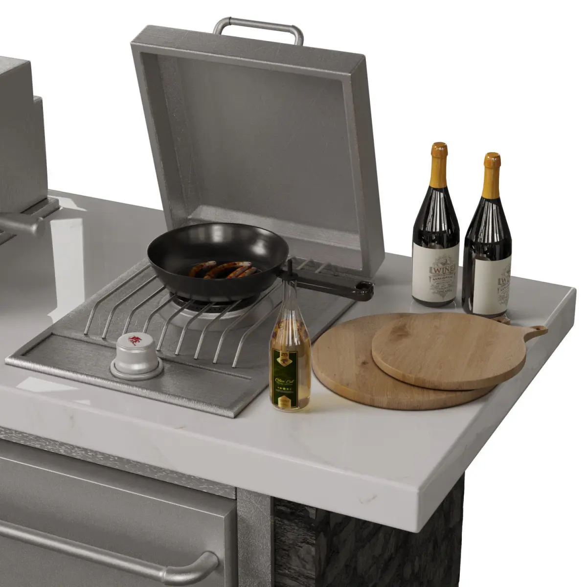 BULL BBQ is outdoor grill with 4 parts . main grill , food , grill door and cooktop door . these parts are separated to edit and can open and close doors easily or edit or delete foods .all material and parts are named logically .most of the textures are 4k .dimension is 290 * 75 height is 100 up to counter and 135 up to grillmodeling in 3dmax 2018 and save as in max 2015 versionpolys:139736verts:142453All items are UVW mapped.Max 2015 - vray 3.6Max 2015 - corona 6obj , fbx