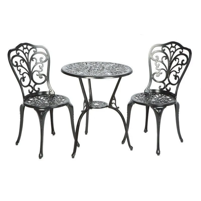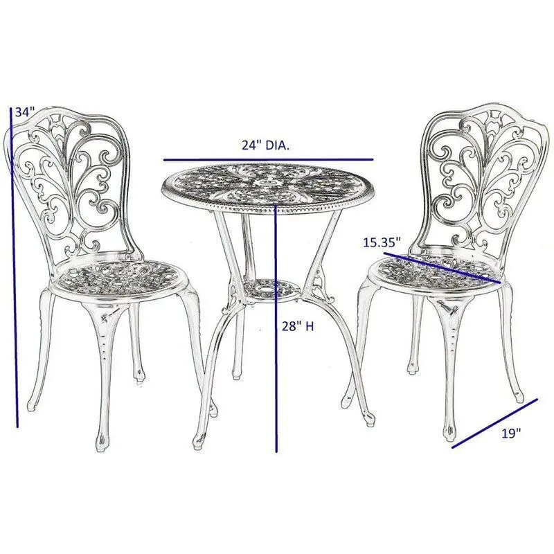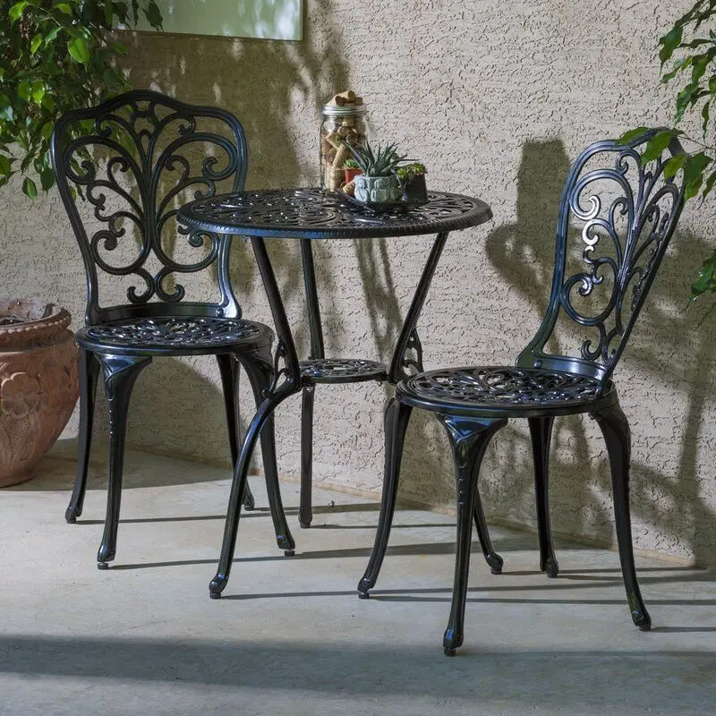- Lend your outdoor ensemble a splash of European elegance with this chic three-piece bistro set. Made from cast aluminum in a weather-resistant, powder-coated finish, this circular cafe table showcases a swirling scrollwork motif with floral accents and fleur-de-lis detailing, while each chair strikes a classic