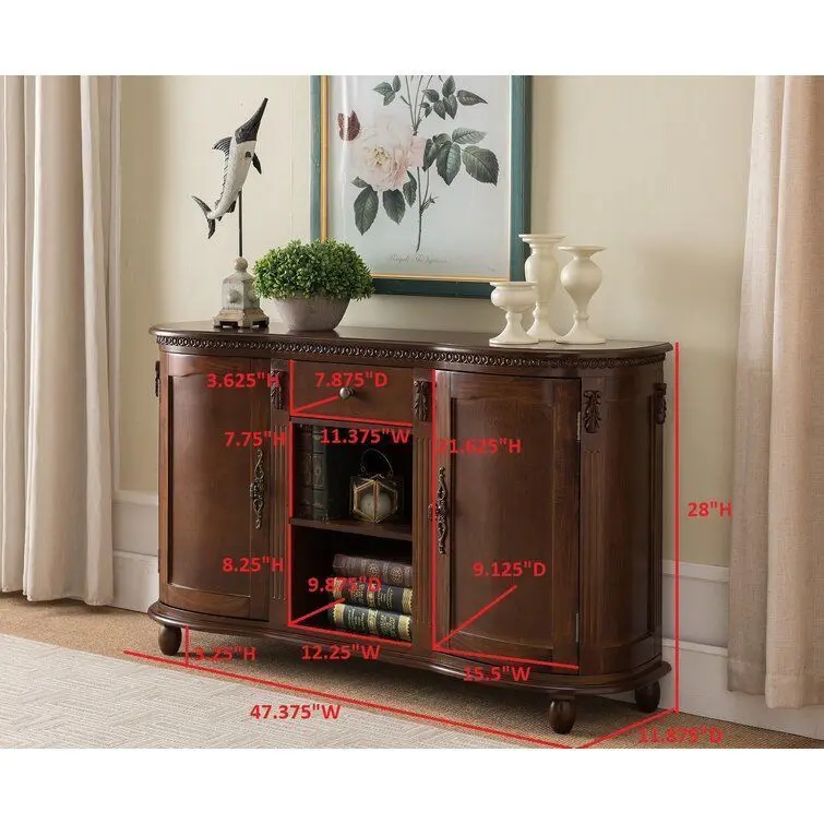 - Reminiscent of the intricate designs found in hotel resorts and classical homes, this sideboard brings both style and storage to your dining space. Crafted from manufactured wood, it’s founded atop bun feet and demonstrates ornate detailing and architectural details that draw the eye. Open shelves and a pair of cabinets make space for stashing serveware, spare linens, and more, while a broad top offers a place to stage an array of decorative accents.