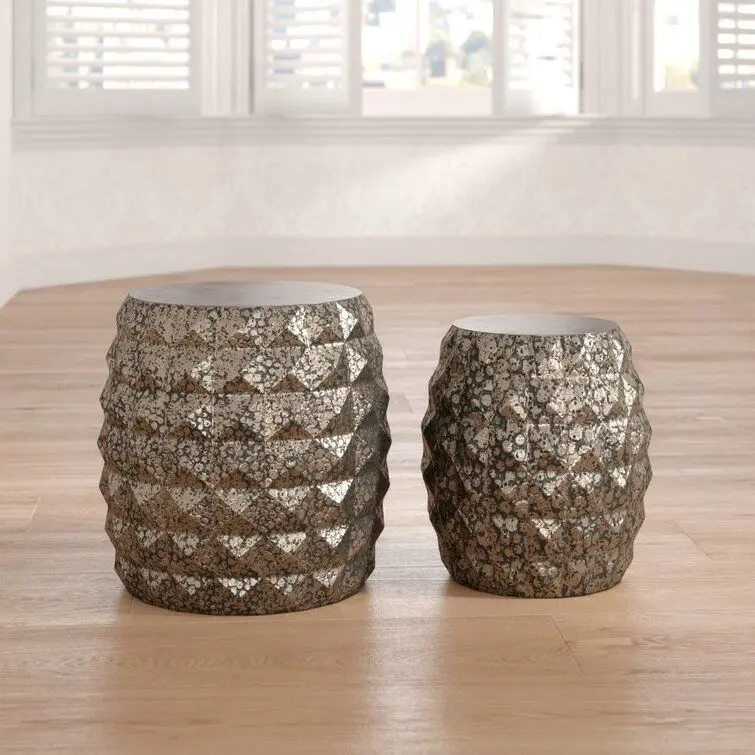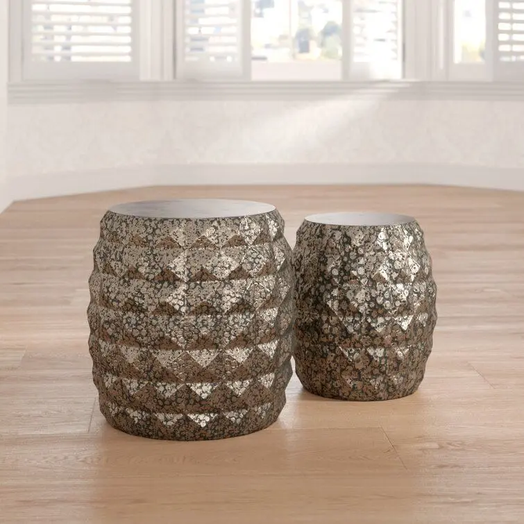 - A hammering process is used to create the series of circular indents on each stool's surface. Combined with the geometric pattern it results in a pair of textured decorative pieces that can be used to complement traveller/fusion design settings. Both are formed from tough iron that enhances their reflective appeal.