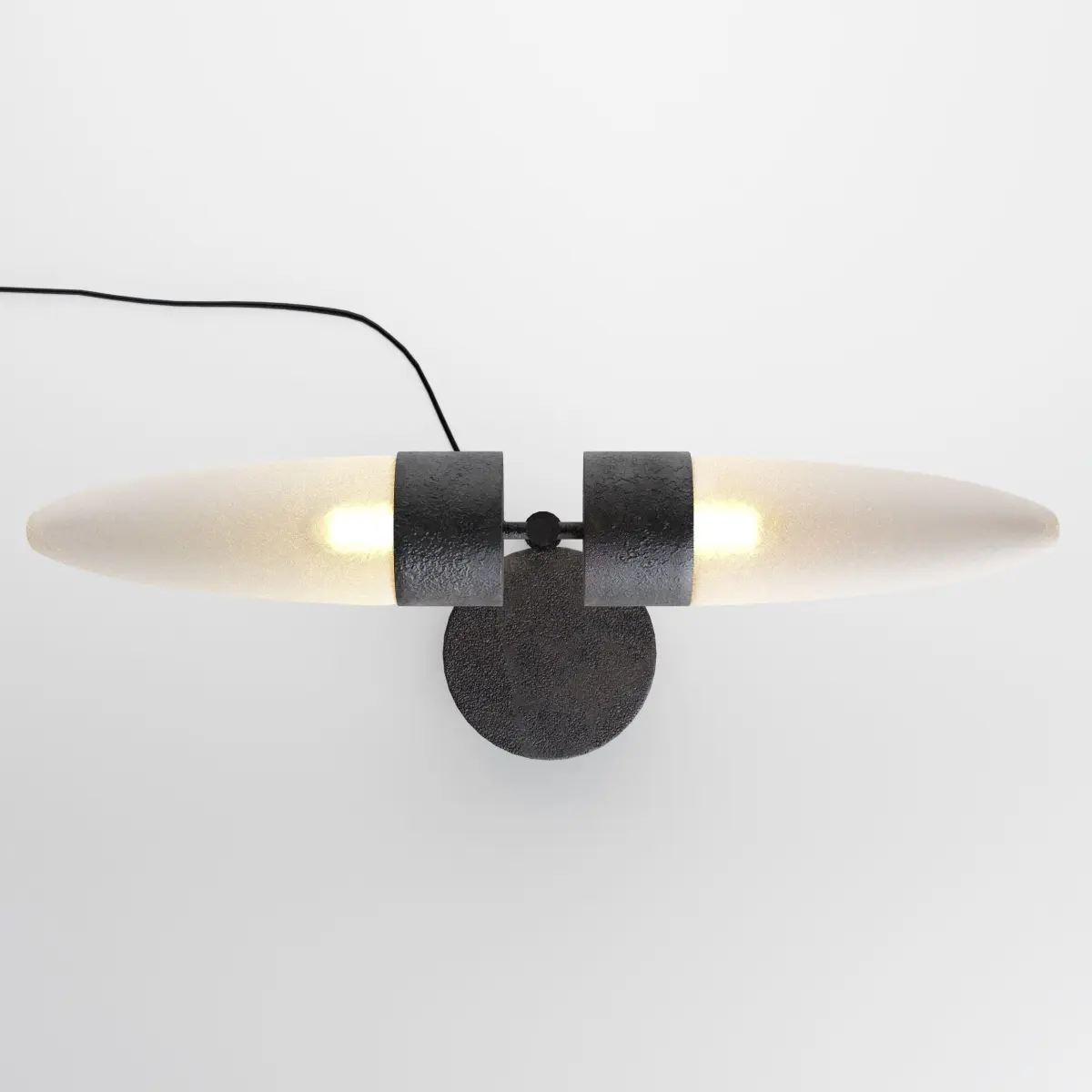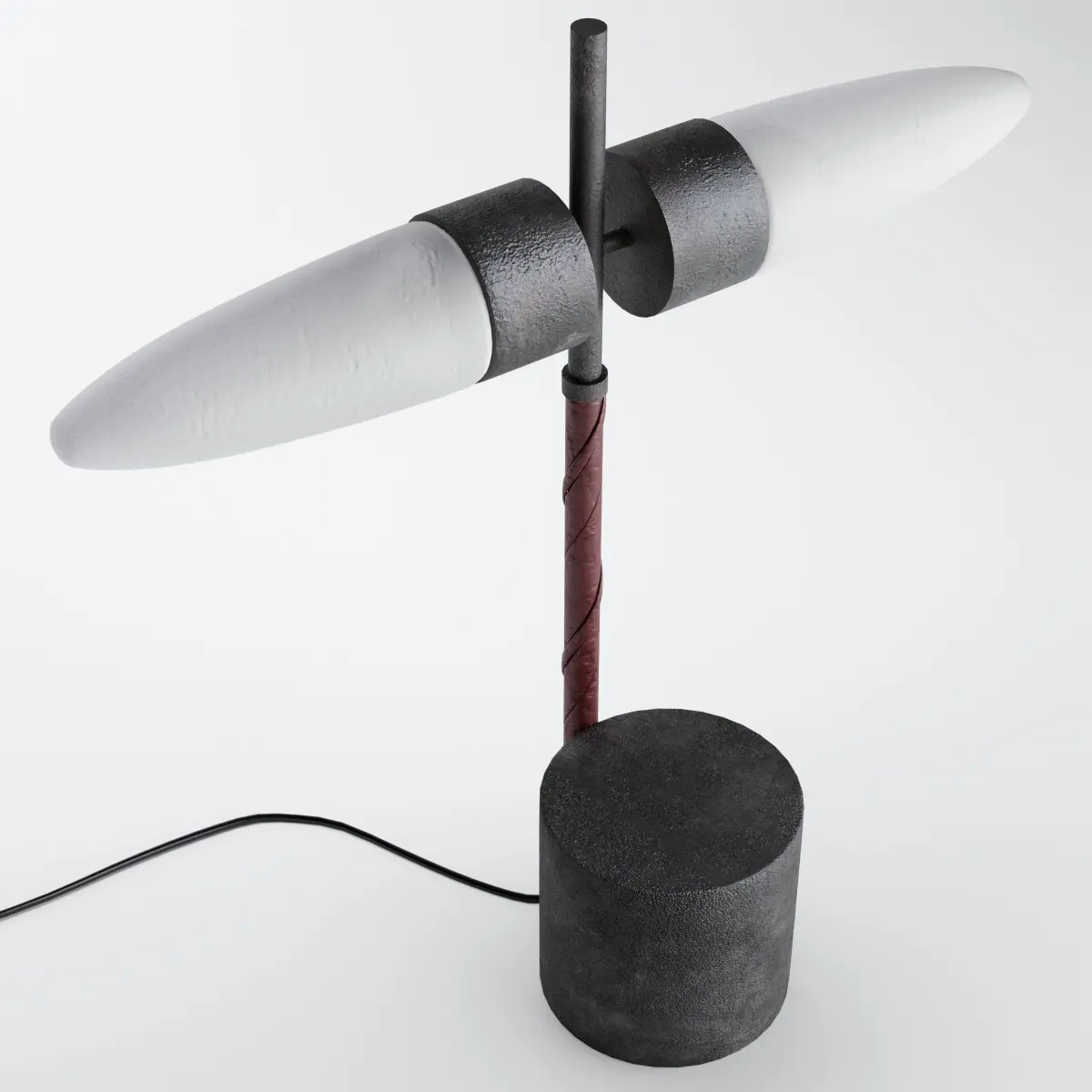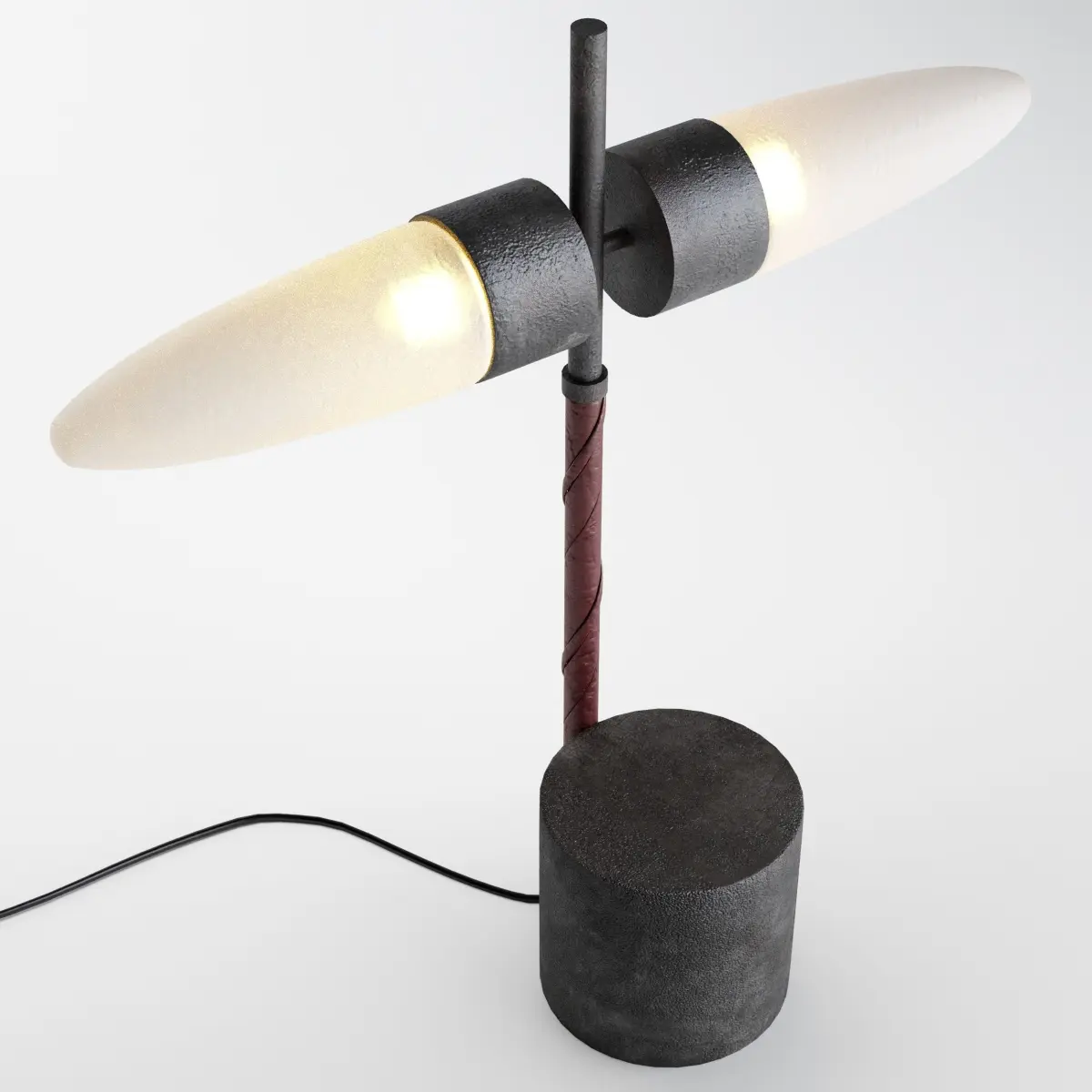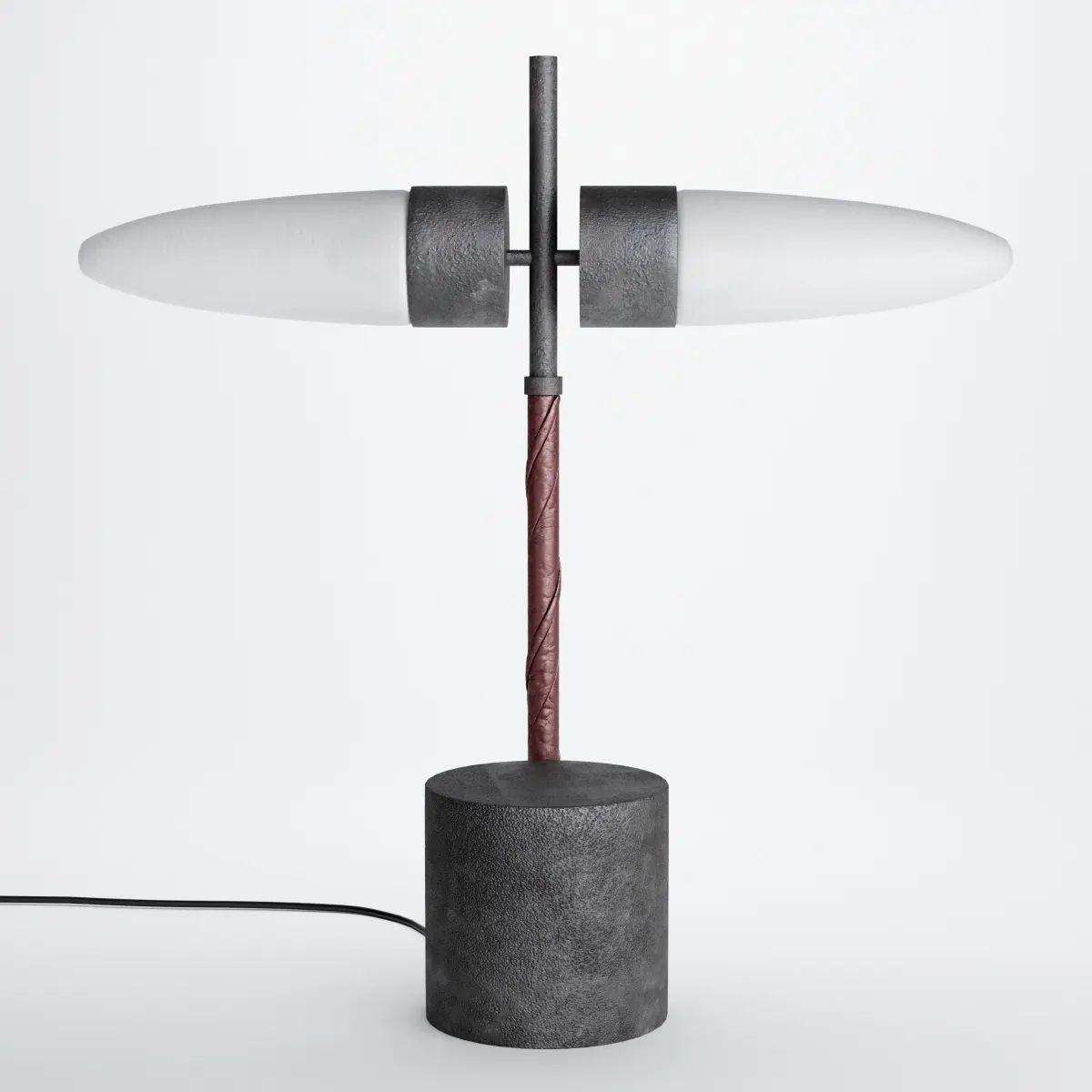 The body consists of an unpolished gray marble base with a lamp arm in oxidized aluminum covered in spun cognac colored leather. An upper part in oxidized aluminum and an upper part in oxidized aluminum that stands in beautiful contrast to the light, translucent glass. This subtle interaction of materials makes the Bull lamp much more than merely a source of light.(Taken from the product description)