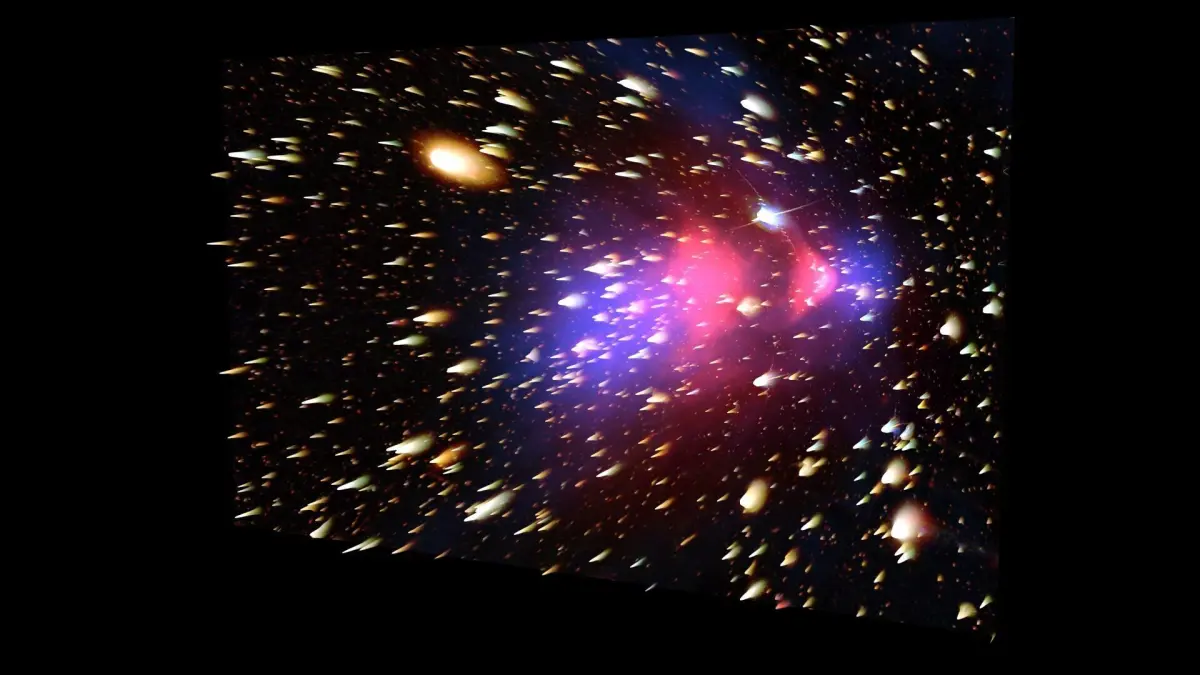 DescriptionBullet Cluster. This Bullet Cluster is like a gas cloud with blue and pink colors. The Bullet Cluster (1E 0657-56) consists of two colliding clusters of galaxies. Strictly speaking, the name Bullet Cluster refers to the smaller subcluster, moving away from the larger one. It is at a comoving radial distance of 1.141 Gpc (3.72 billion light-years). The object is of a particular note for astrophysicists, because gravitational lensing studies of the Bullet Cluster are claimed to provide strong evidence for the existence of dark matter. Observations of other galaxy cluster collisions, such as MACS J0025.4-1222, similarly support the existence of dark matter. The major components of the cluster pair—stars, gas and the putative dark matter—behave differently during collision, allowing them to be studied separately. The stars of the galaxies, observable in visible light, were not greatly affected by the collision, and most passed right through, gravitationally slowed but not otherwise altered. The hot gas of the two colliding components, seen in X-rays, represents most of the baryonic, or ordinary, matter in the cluster pair. The gases of the intracluster medium interact electromagnetically, causing the gases of both clusters to slow much more than the stars.