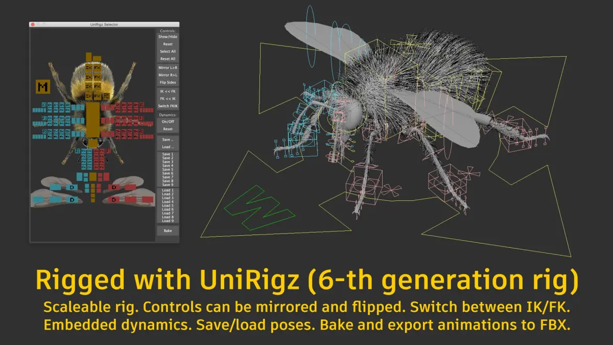 You can save and load poses of model, mirror and flip controllers, easily switch between IK and FK and use dynamics for some parts of model to achieve more realistic behavior.