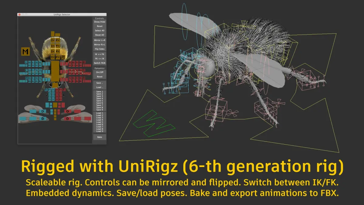 Bumblebee_Rig_Ornatrix_NoDynamics.mb - same as main file, but without dynamics, works faster in viewport.