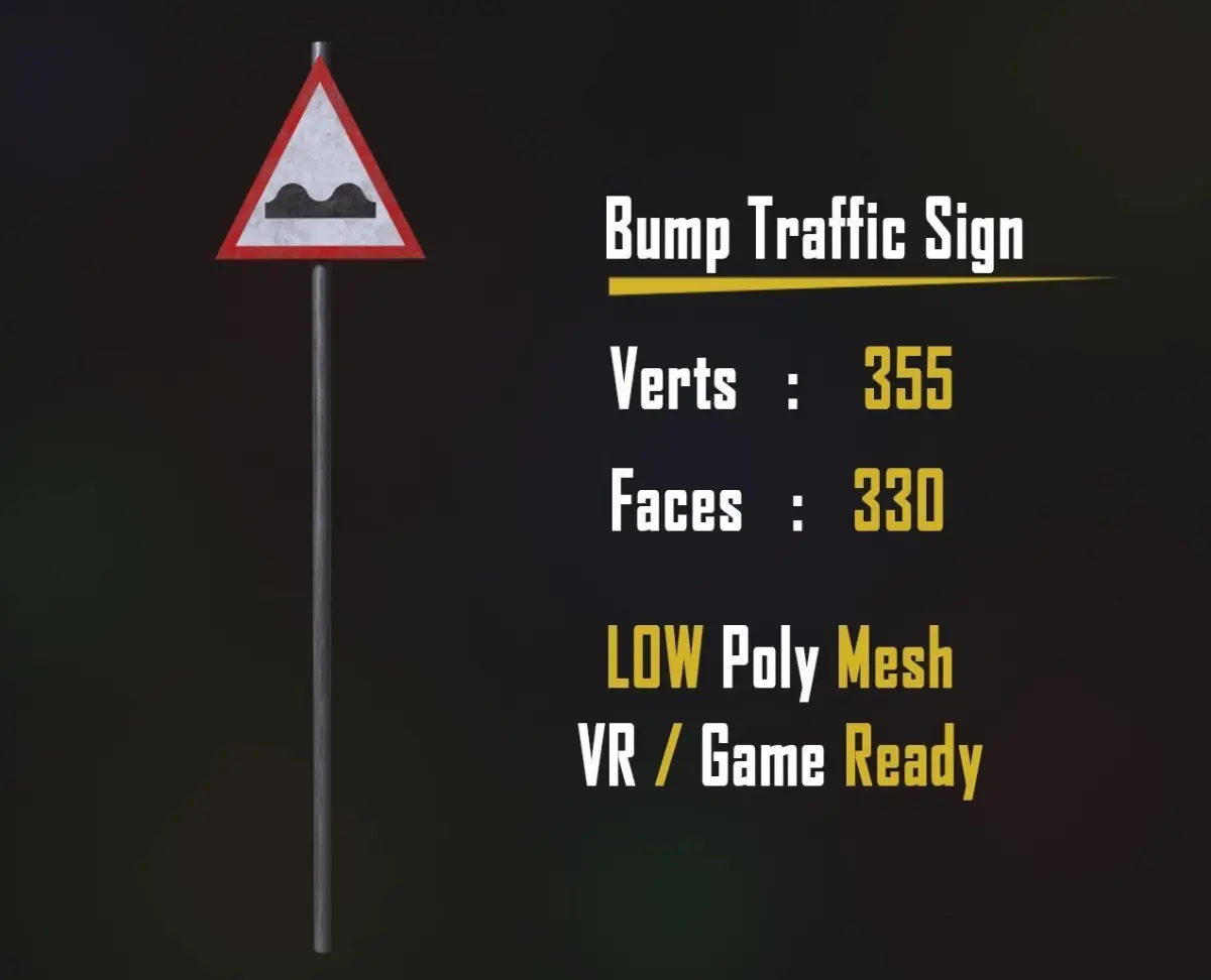Bump Traffic SignLow Poly Mesh , Textures are ready for Unreal Engine 4 Basecolor + Roughness + Metallic + Normal Map + AO . Made By : Rush Studio / Ali Aweda . Folow us on our pages for more free models ArtStation : www.artstation.com/awedaali Facebook : www.facebook.com/RUSH.Studio1 Have Fun