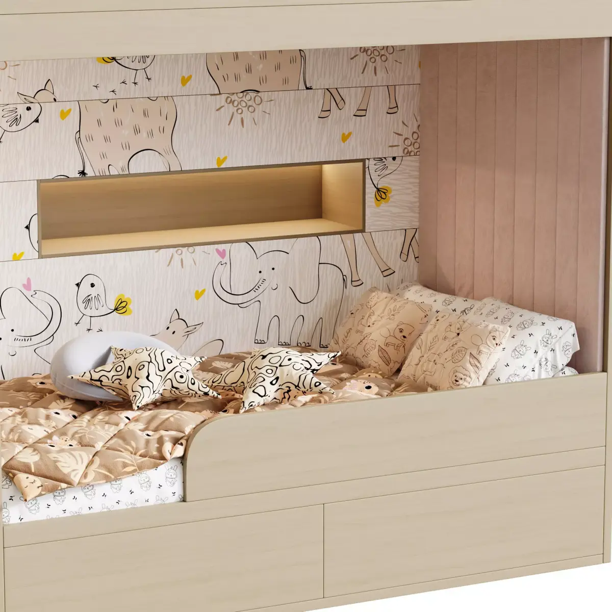 Name: Bunk bed for kids 4Type: modelFormat: 3Ds Max 2016Export: FBX, OBJRender: Corona Renderer 10Polys: 2052813Verts: 1028246Units: CentimetersDimension: 178.11 x 124.12 x 280.0Description: A stylish and functional kids’ bunk bed featuring a clean and modern aesthetic with smooth contours and efficient space utilization. Designed for comfort and practicality, it includes two stacked sleeping zones, built-in shelving for storage, and safety rails for the upper level. The structure combines light wood tones and minimalist detailing, creating a warm and inviting atmosphere in children’s rooms. This high-quality 3D model is optimized for Corona rendering and ideal for interior visualizations of contemporary or Scandinavian-style kids’ spaces.