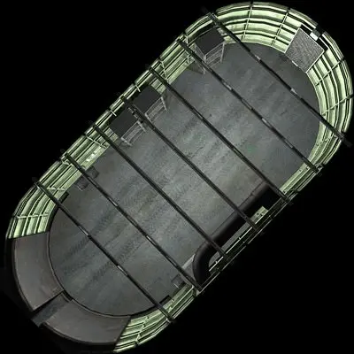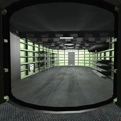 A reinforced garage for military vehicles with armoured swinging doors. For realtime graphics.