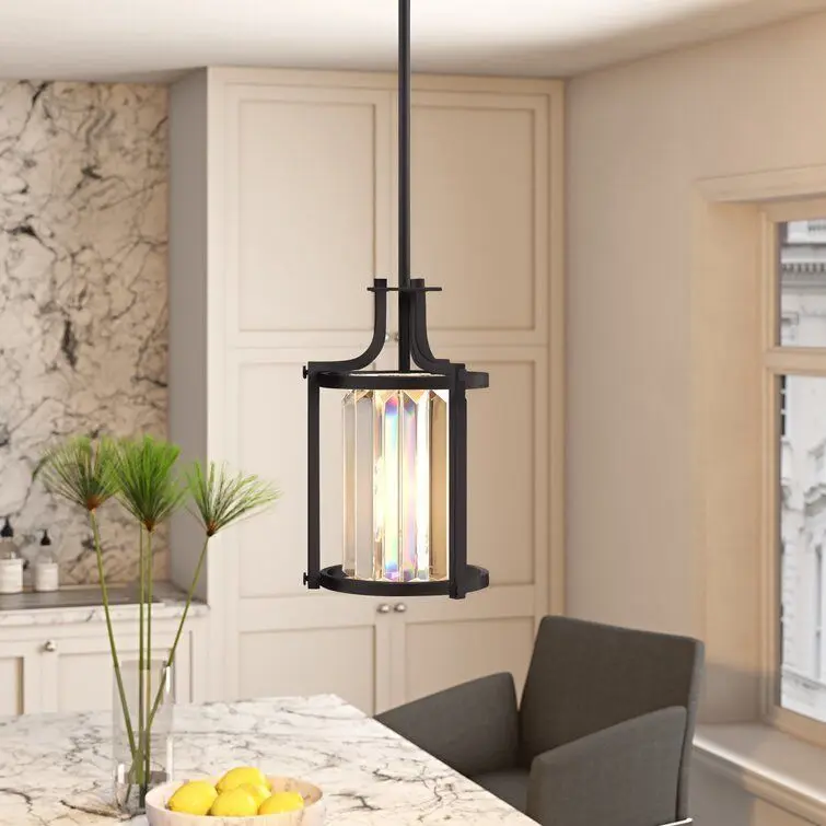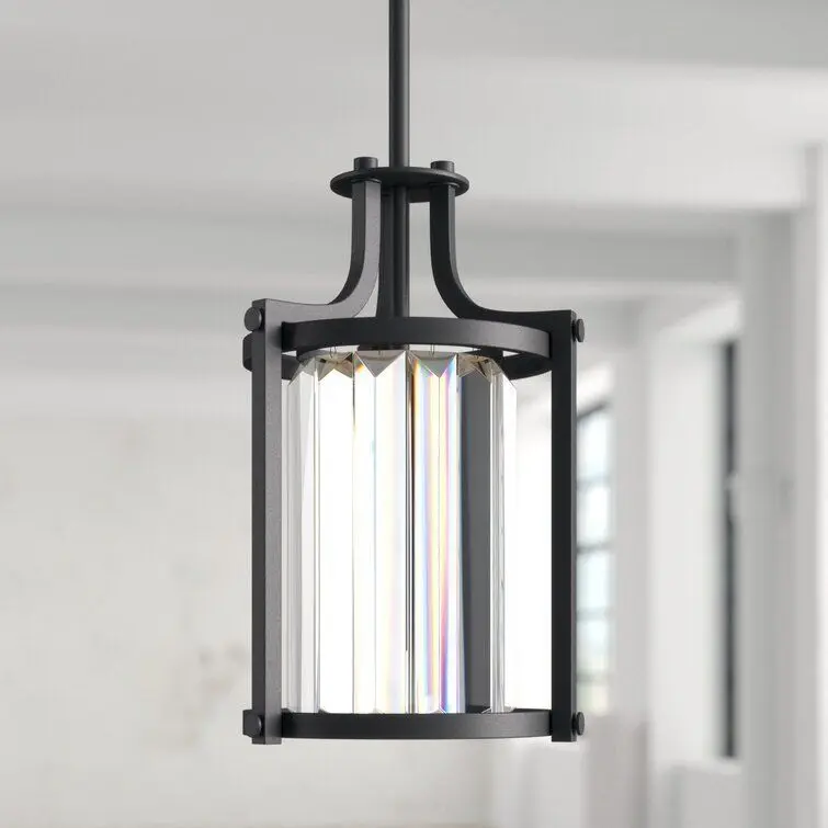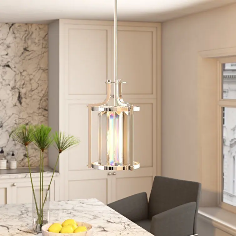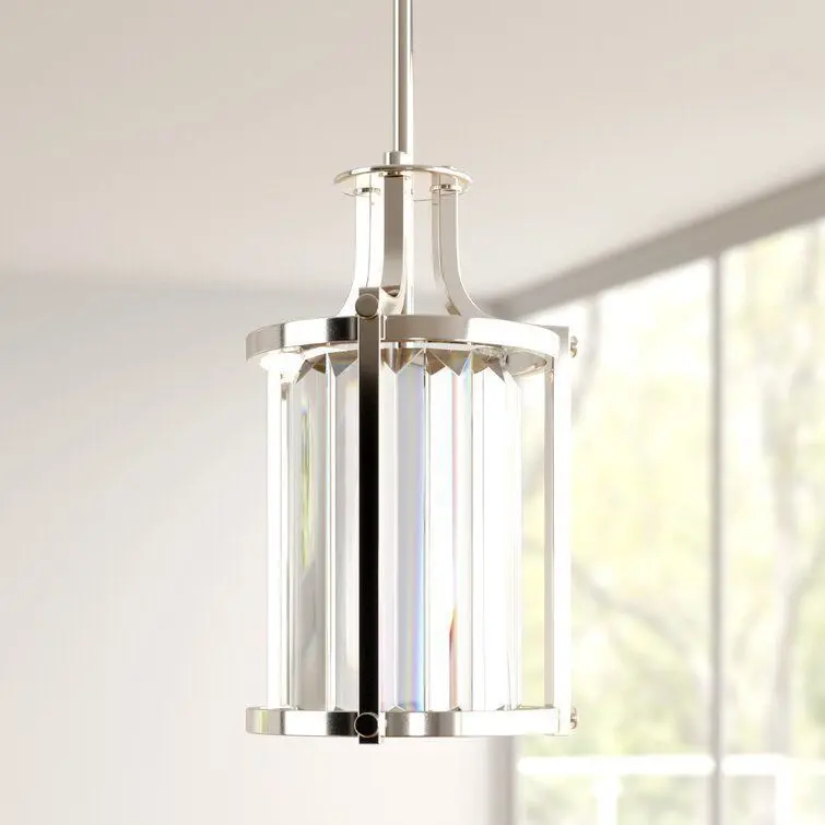 - Simply-chic style gets a glam update in this lantern. Crafted of metal in a fashionable finish, this fixture features an open drum frame accented by curved arms and decorative screw caps. Inside, a faceted crystal shade ensconces one 60 W incandescent E26 bulb (included) to diffuse bright light as it's dispersed throughout your space. Rounding out the design, an adjustable length of downrod suspends the unit from a matching canopy above.