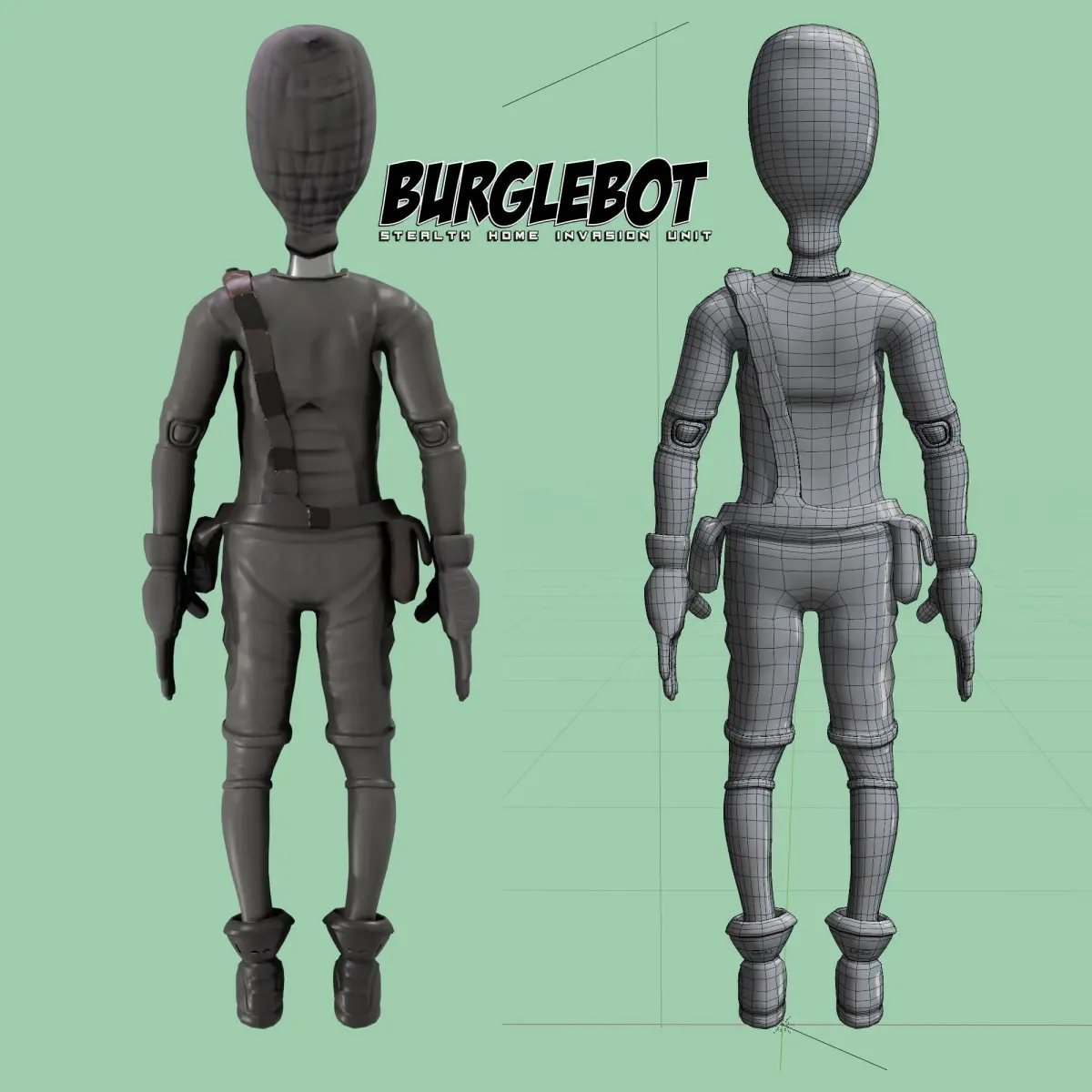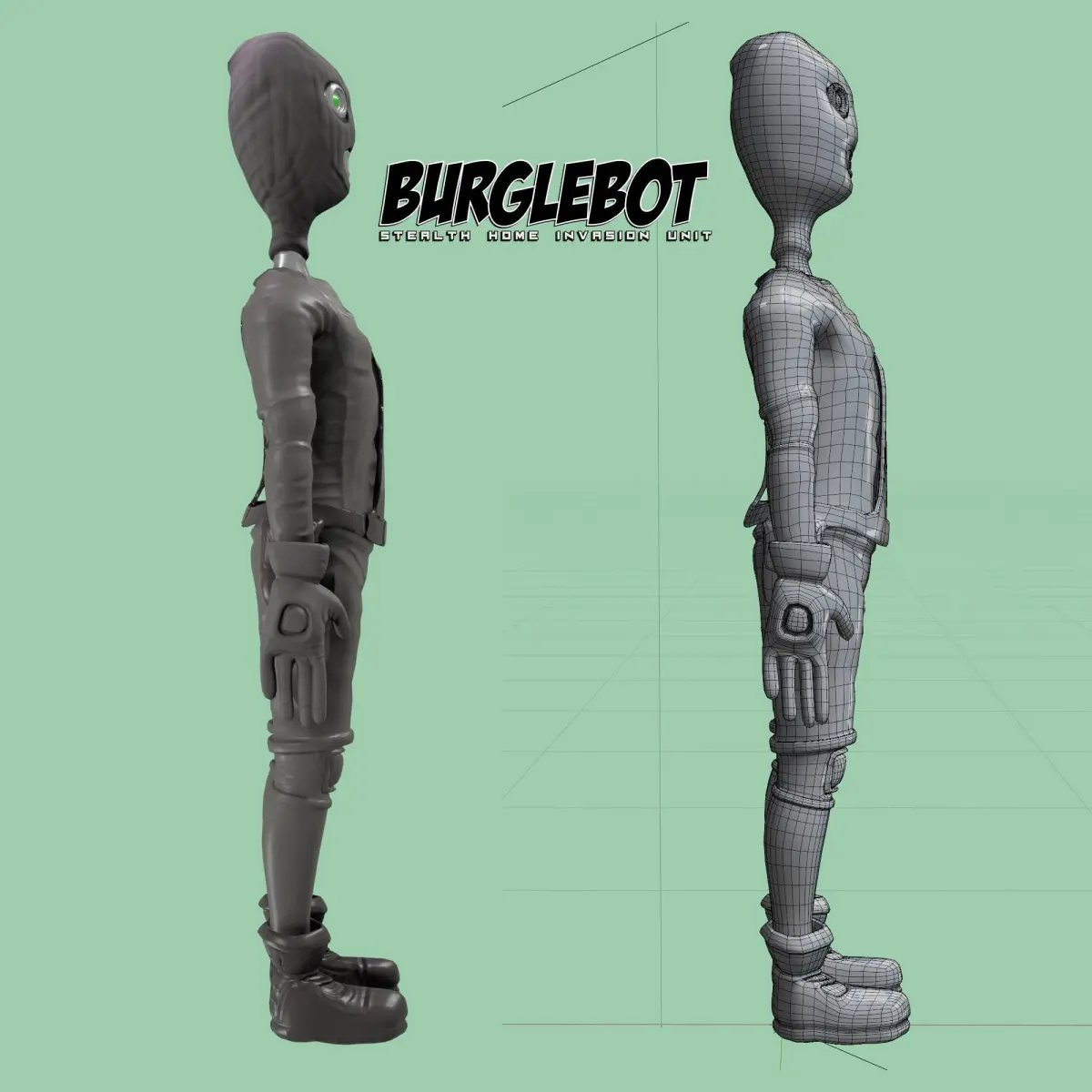 Buglebot. Burglar style robot fbx character. Modeled in Gravity Sketch, high poly details sculpted in Z brush baked onto 19,038 poly model. PBR textures (4096x4096) include: Base Color, Normal, Metalic and Roughness. ZIP files contains character tposed in .obj, .fbx, .fbx with embedded textures, texture files, .blend file, and renders of model in individual named folders.