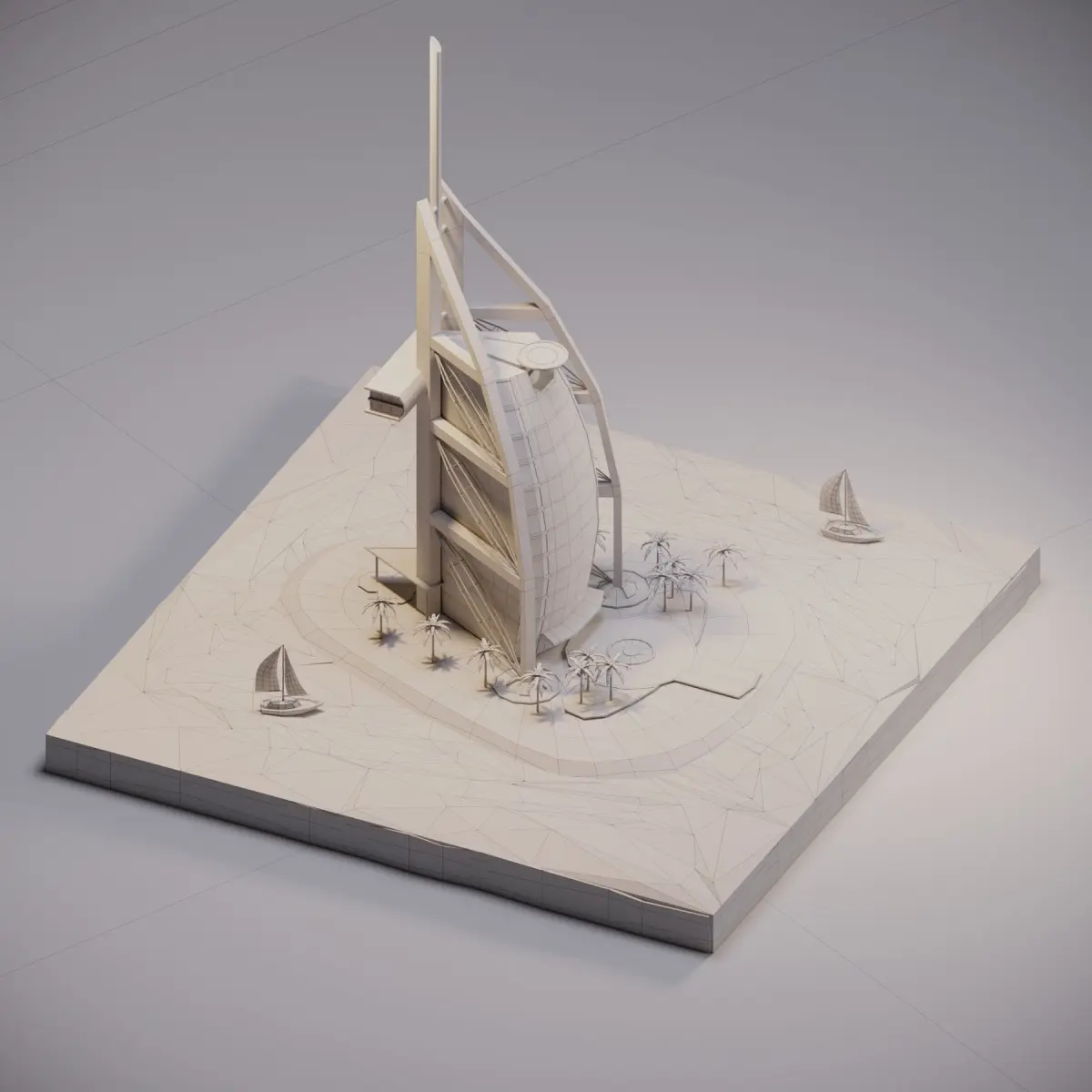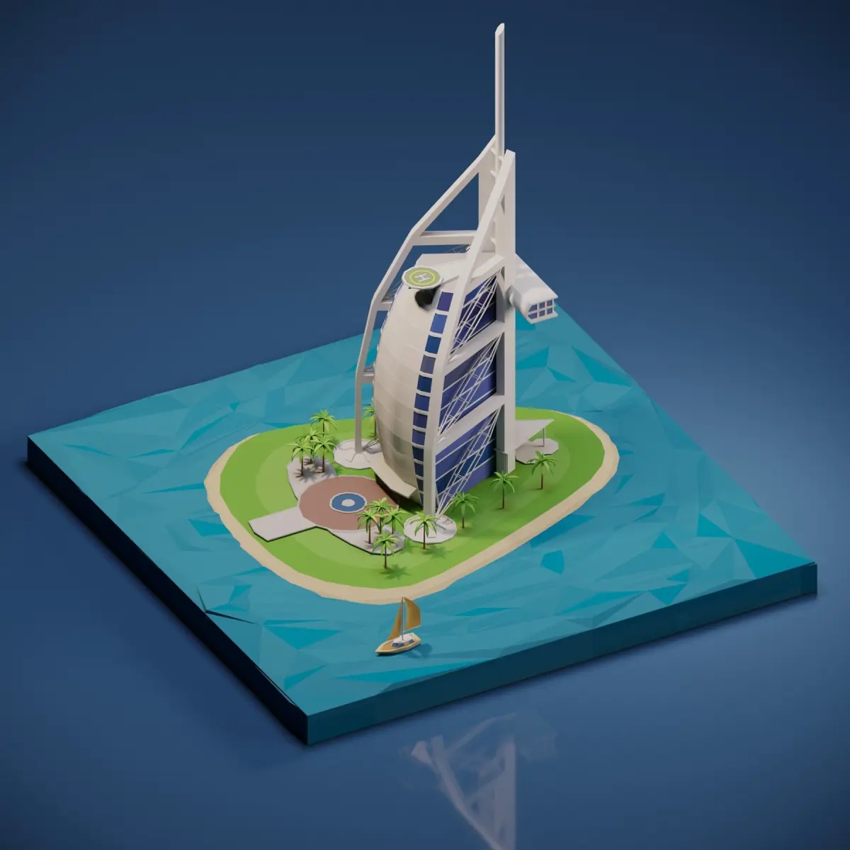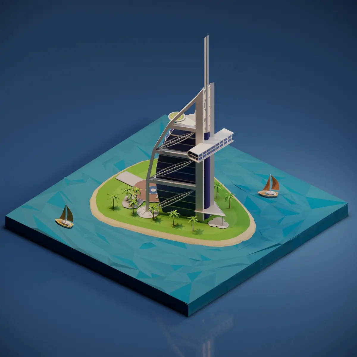 Burj Al Arab to your project with this low-poly 3D model. Optimized for VR, AR, and gaming, it combines elegance and efficiency, perfect for architectural presentations, virtual environments, and cityscapes.