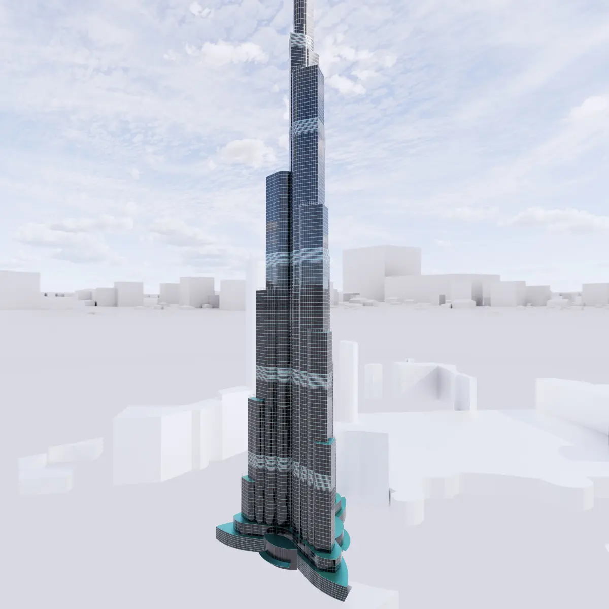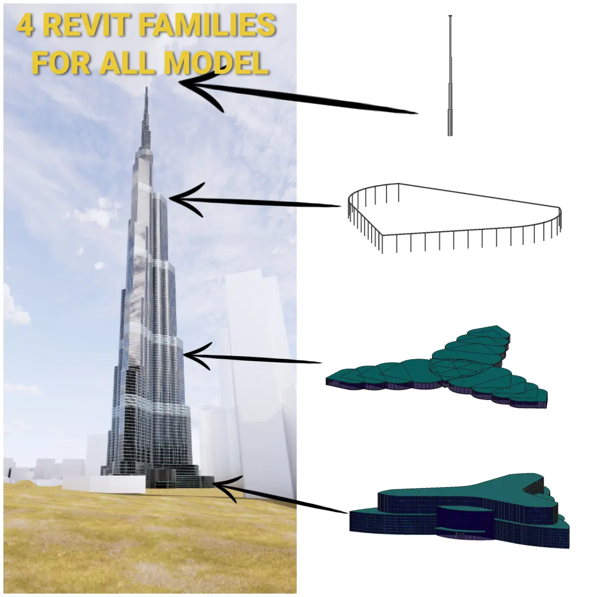 This model of Burf Khalifa as you can see in images is based on 4 parametric Revit Families. (Sky wire at the top, Railings, Floors and Bottom Floors )