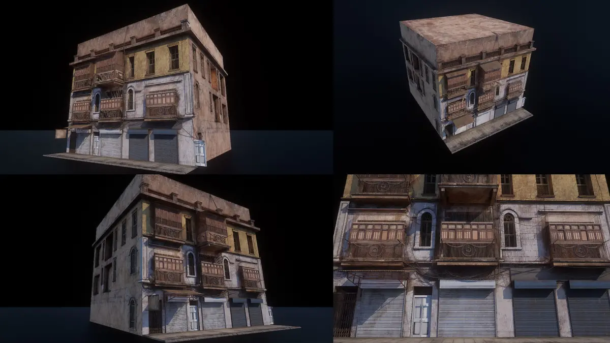 These Buildings are created to Replicate old City Area of Karachi and BurnsRoad.The Buildings are made by referring to photographs and has all the exterior details of an original building.it can be used not to Populate old city Areas.number of mashes:73