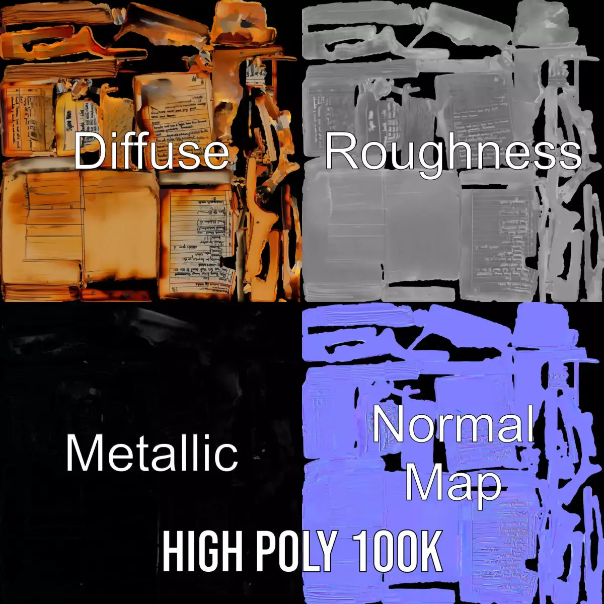 This Burnt Book Pages 3D Model Pack features detailed textured pages with a burnt effect, ideal for historical or fantasy scenes. Each model has 3 levels of detail: low-poly (1000 triangles for mobile), middle-poly (10,000 triangles for environment), and high-poly (100,000 triangles), which allows for the use of this model in production rendering (such as 3ds Max, Maya, Cinema 4D, Blender, Vray/Corona/Cycles and all others), game engines (Unity and Unreal compatible), and interactive presentations, providing a choice of detail based on the LOD System principle. Suitable for use in video game environments, cinematic sequences, and virtual reality experiences. The model's textures are PBR, Diffuse, NormalMap, and reflection/roughness/metallic, which are suitable for any modern rendering engine. All models accurately unwrapped and have no overlapping UV. All textures are 4096*4096 in size. The first image is the reference used for creating the 3D model. It is important to carefully evaluate the quality of the model by examining the preview images that display the topology and polygonal mesh. These previews (WIRE and WEB 3D Preview) clearly demonstrate how accurately the model matches the original reference and how well the geometry has been executed. Please like and leave a comment if you enjoyed the model.