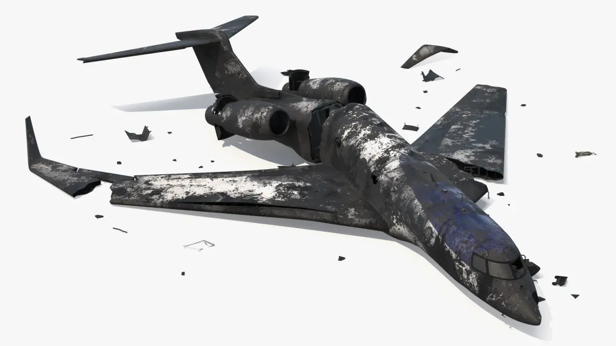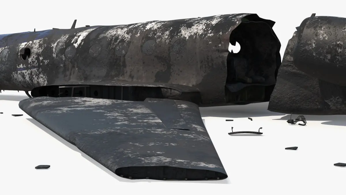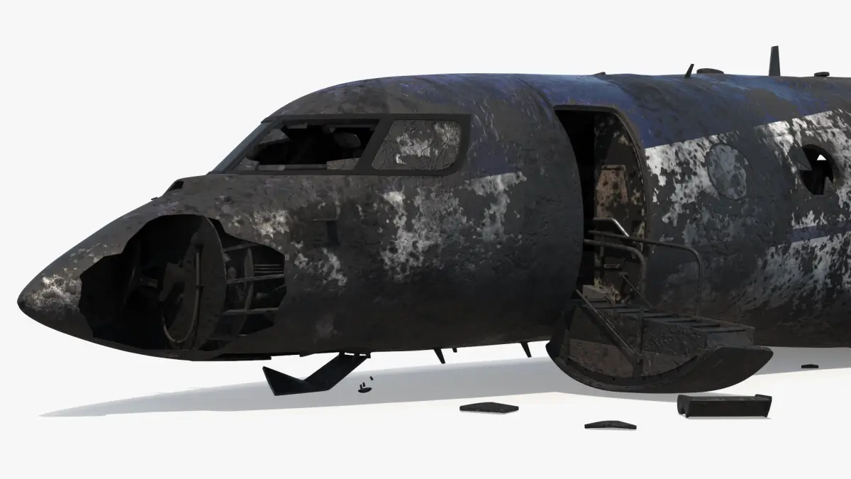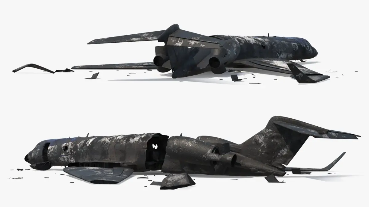 This model depicts a dilapidated jet plane scattered in pieces. The detailed wreckage includes a broken fuselage, wings, and engines, showcasing a realistic portrayal of an aviation disaster. The texture emphasizes a corroded, weathered appearance, adding to the authenticity of the scene.