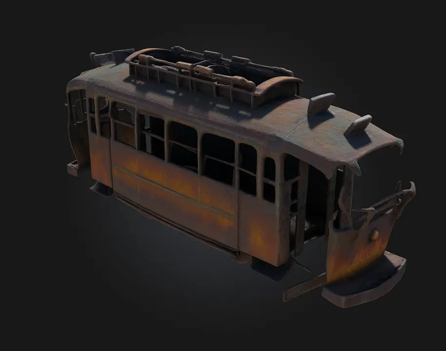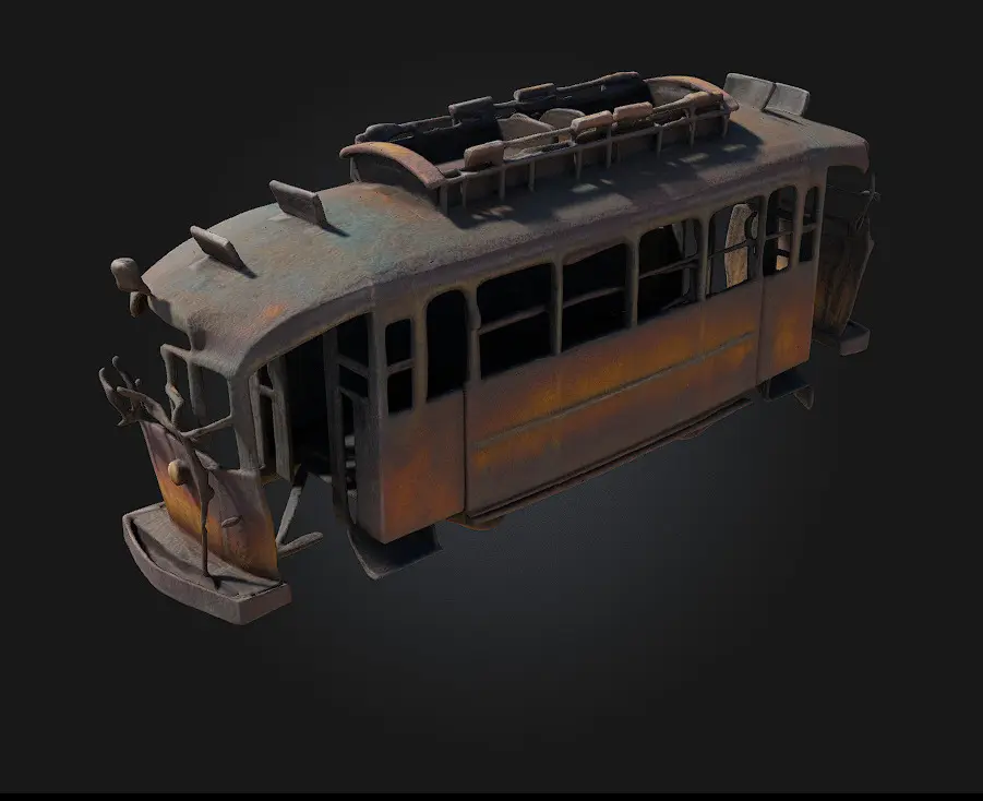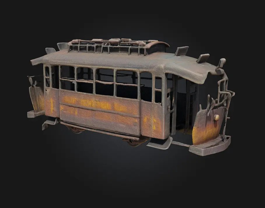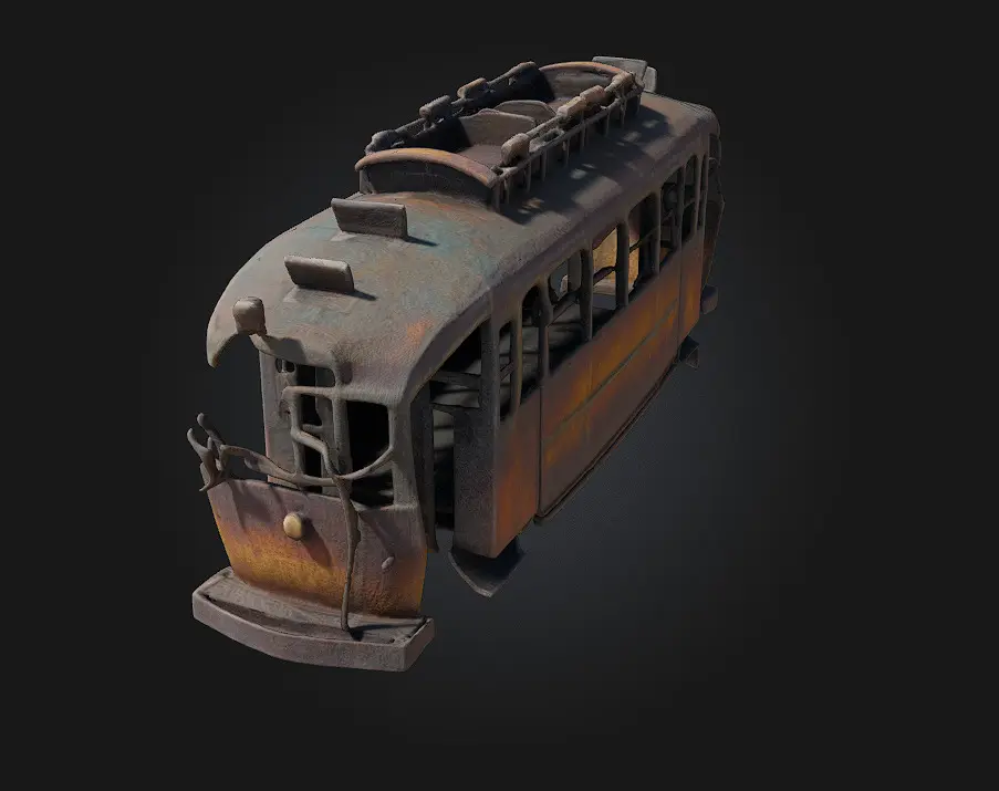 The Burnt Streetcar Relic model captures the haunting remnants of a once-bustling urban tram, now left scorched and silent. Ideal for post-disaster environments, cinematic ruins, or historical decay scenes.