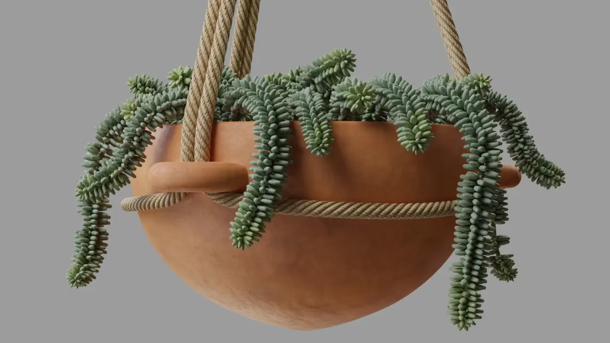 The file includes a Burro's tail succulent (donkey's tail succulent) and a Hanging ceramic planter.