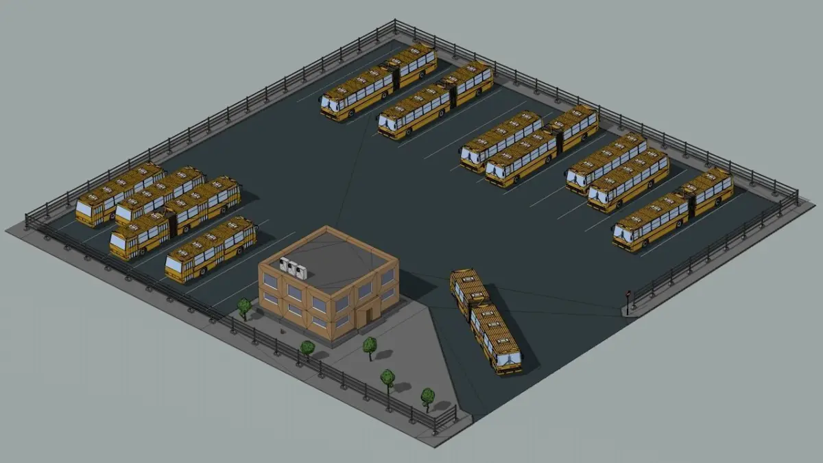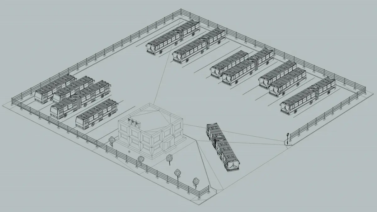 Low-poly 3d model of a bus depot. Оnstage of the city passenger bus IKARUS in two versions, depot, on the territory of trees, the territory is limited by a fence and a road sign