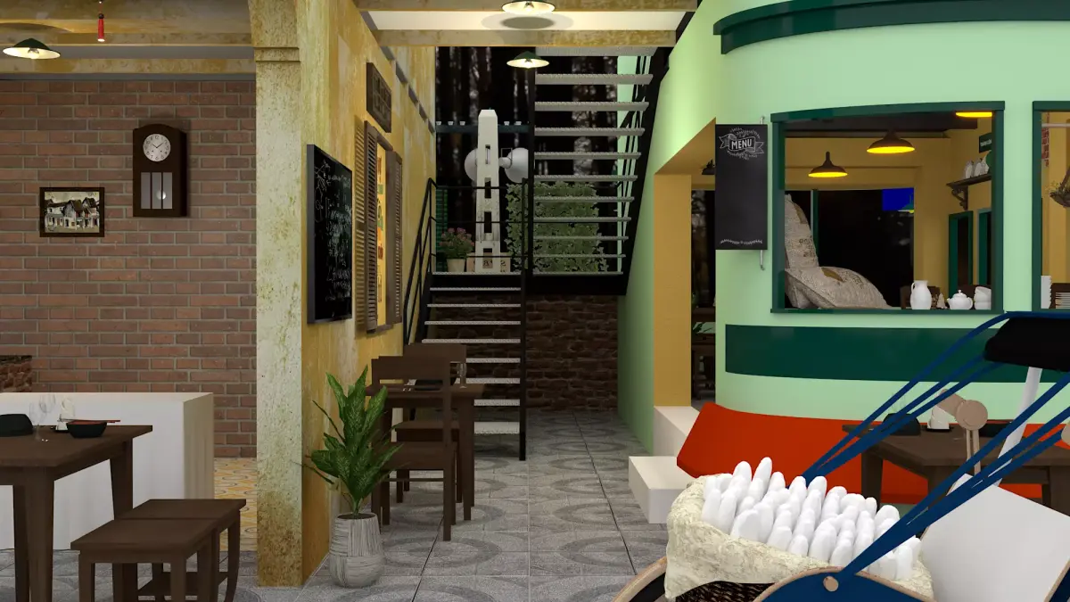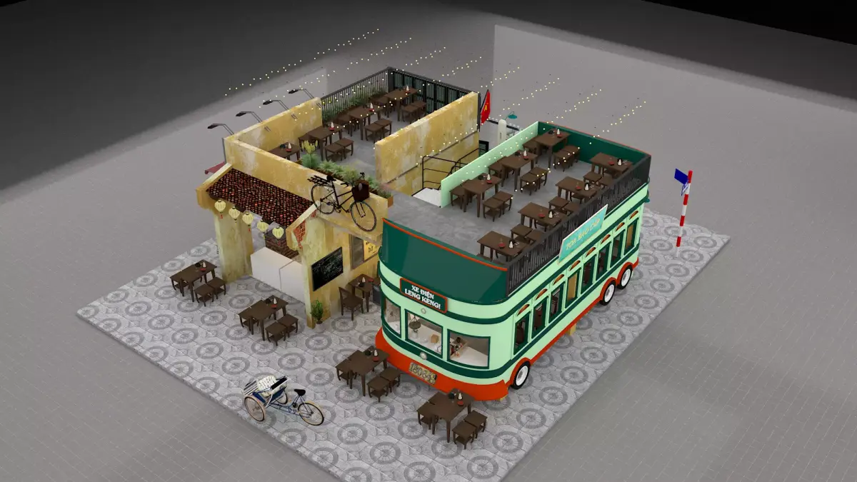 This restaurant design is a captivating fusion of nostalgic Old Hanoi aesthetics and creative modern architecture, centered around the iconic Leng Keng tram. The centerpiece is a stylized double-decker tram featuring a vintage seafoam green and red color palette, with the upper deck ingeniously repurposed into an open-air dining terrace.