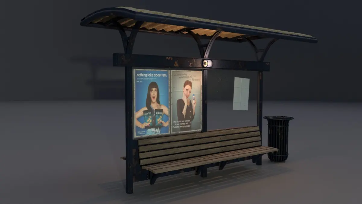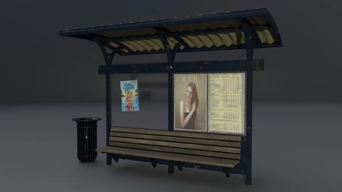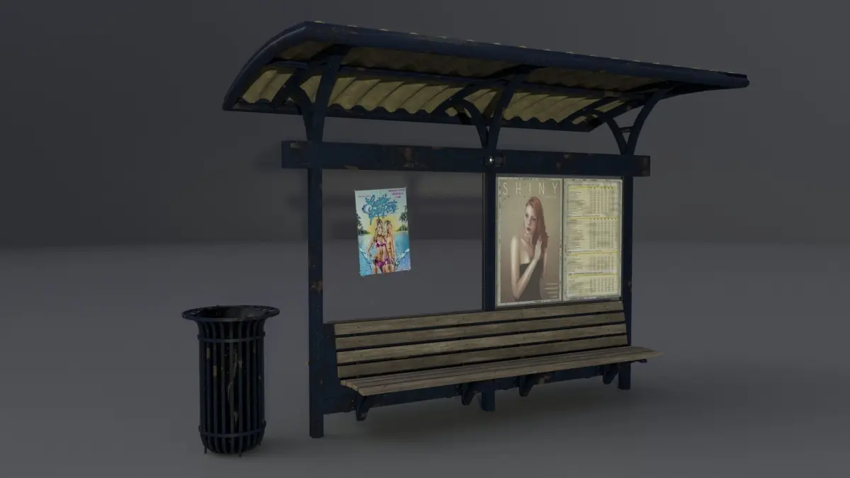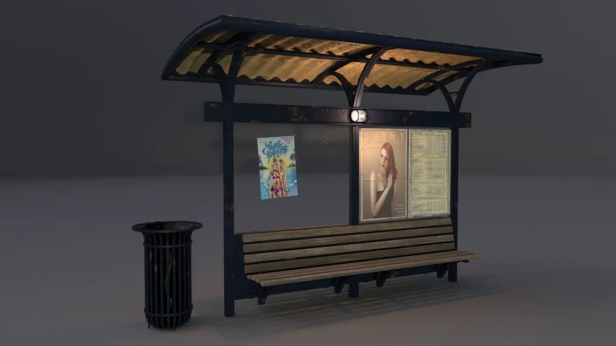 A model of a bus station with a trashcan.