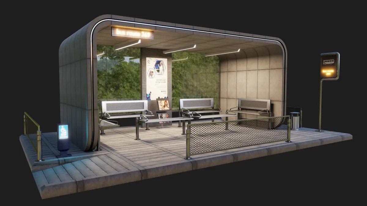 Description:Introducing a meticulously crafted modern bus stop model, meticulously designed using Blender software version 3.6.0 and rendered in the high-quality Cycles engine. This 3D model is a testament to precision and attention to detail, making it an ideal asset for architectural visualizations, urban planning projects, and immersive environments.