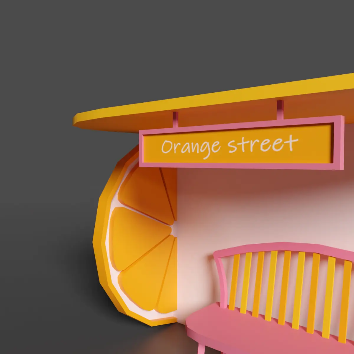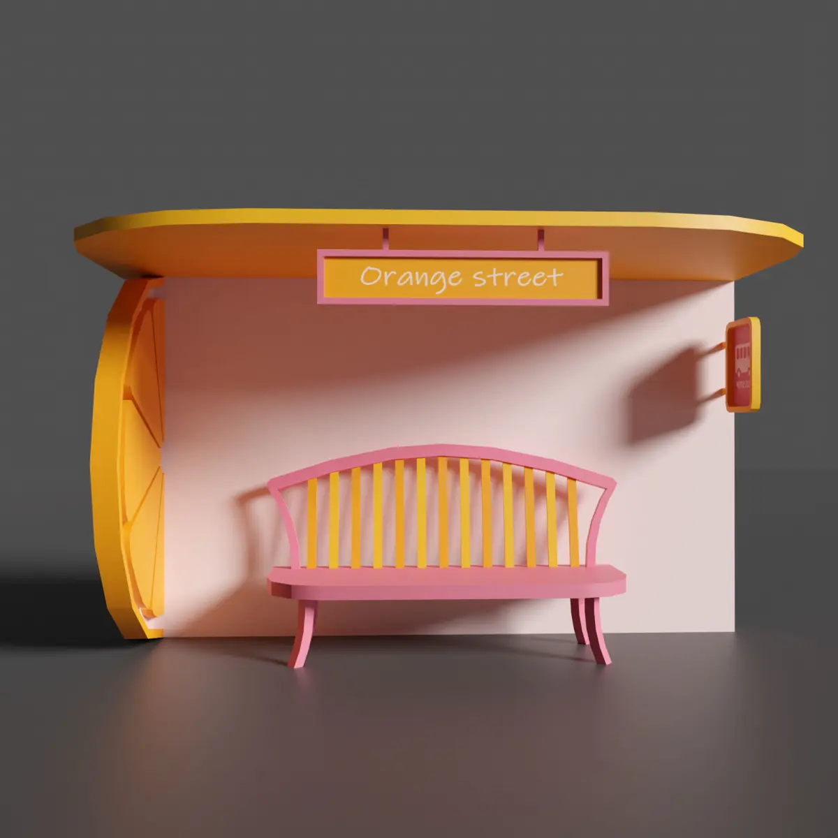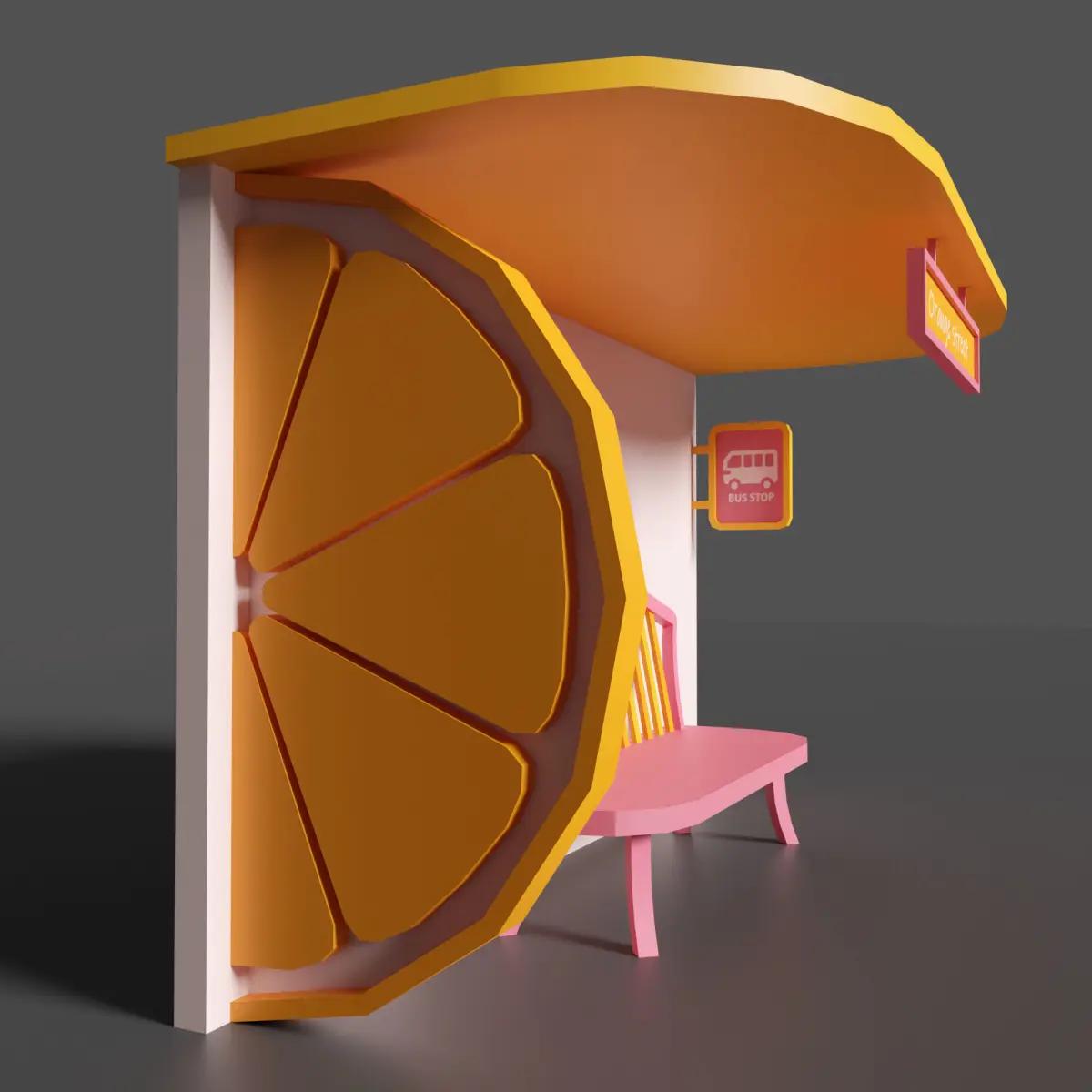 Low poly 3D model - Bus stop Orange street. This amasing coloured and bright bus stop will be really nice for your low poly exterior. Available in different formats : FBX, OBG, Blender files, 3ds max +texture. This model includes a minimum number of polygons. Created in Blender.