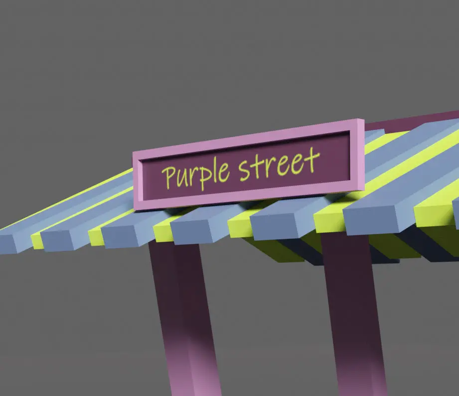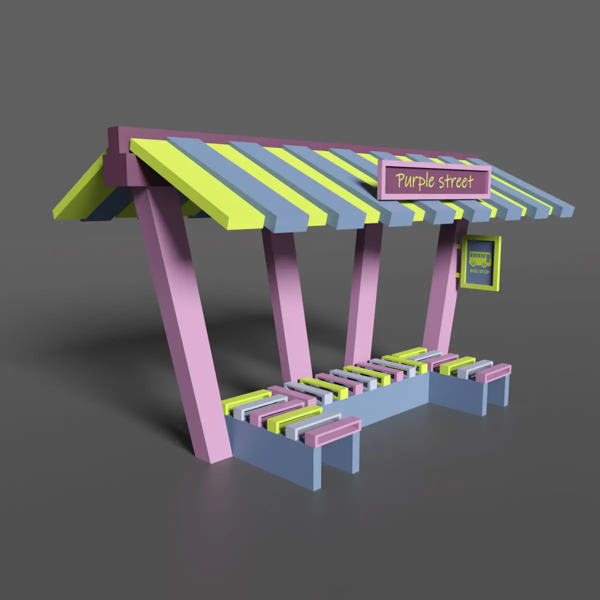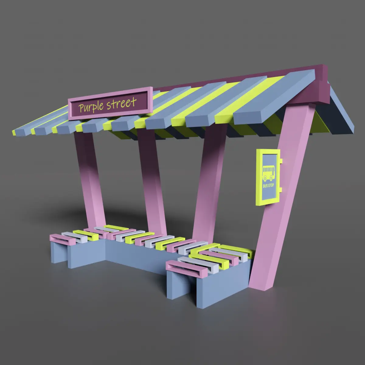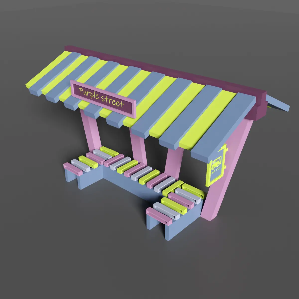 Low poly 3D model - Bus stop Purple street. This amasing coloured bus stop will be really nice for your exterior. Available in different formats : FBX, OBG, Blender files +texture. This model includes a minimum number of polygons. Created in Blender.