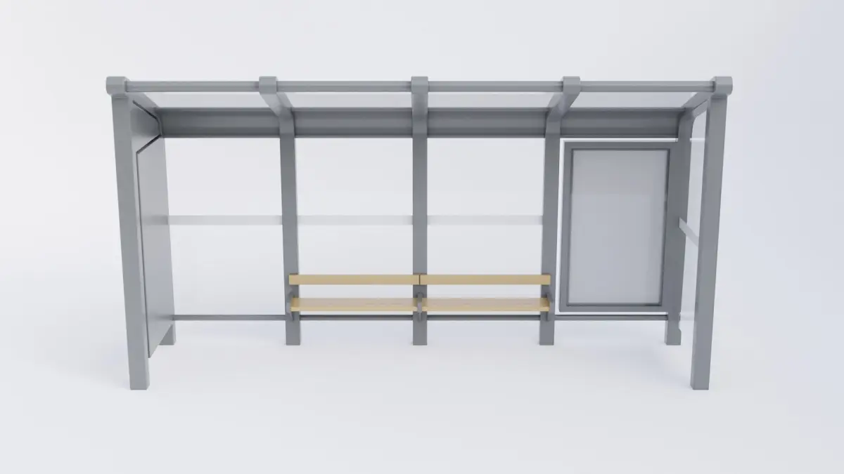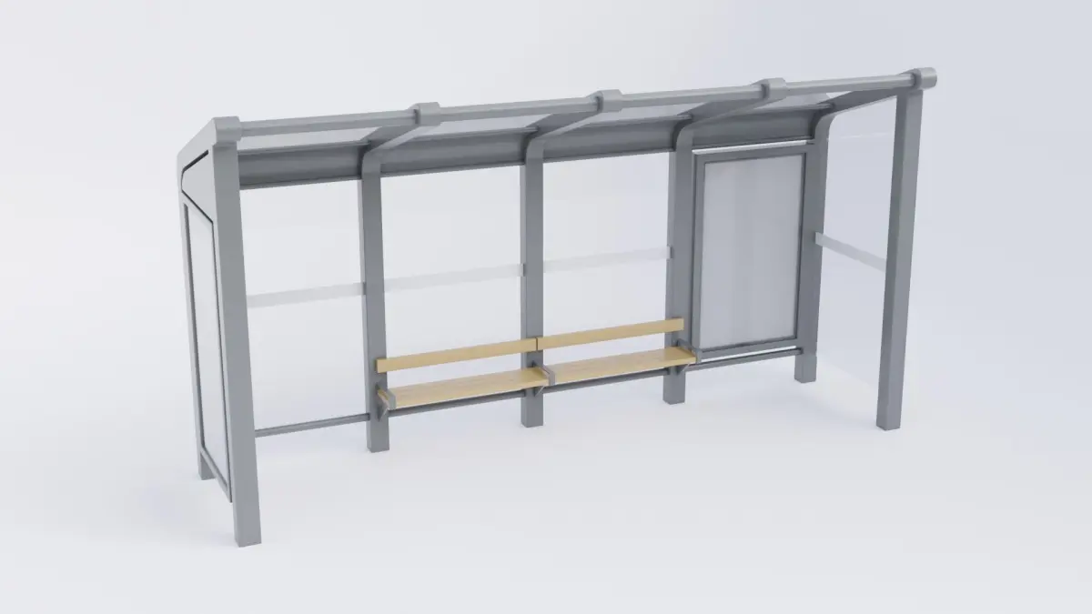 Bus stop shelter 3D model that was made using Blender. This model was made using materials that have been baked into game ready PBR textures and uses clean topology. It has a diagonal roof with two advertising areas which are customizable, and a bench. The glass has white lines in the center so they are visible. This model is low poly.