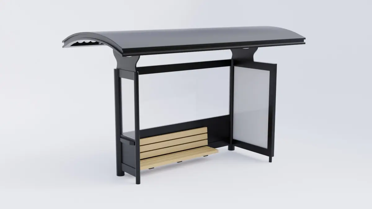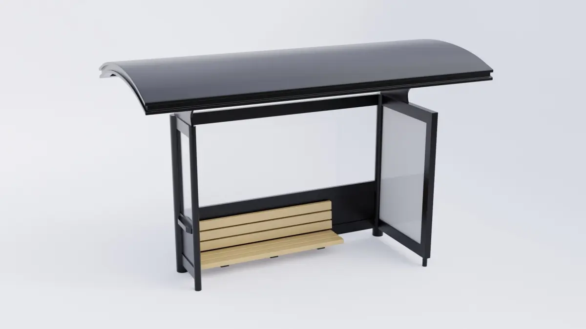 Bus stop shelter 3D model that was made using Blender. This model was made using metallic and transparent glass materials. It has a bench in the shelter, and an area for advertising. This model uses clean topology and materials that have been baked into game ready PBR textures.