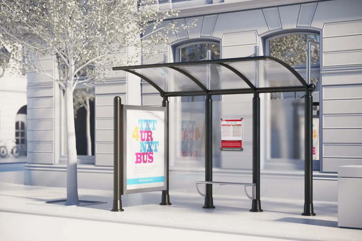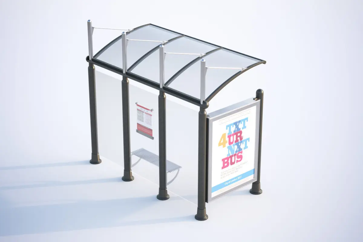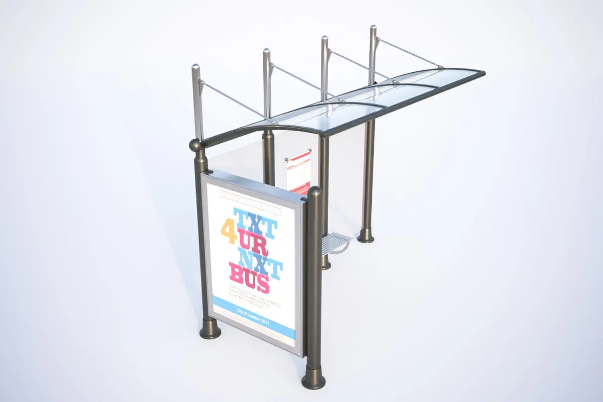 This realistic 3D model includes bus stop consisting of three transparent plastic panels, slightly roofed with a small metal bench. An information board on the side.Model prepared for 3d architectural visualisations and other graphic works.