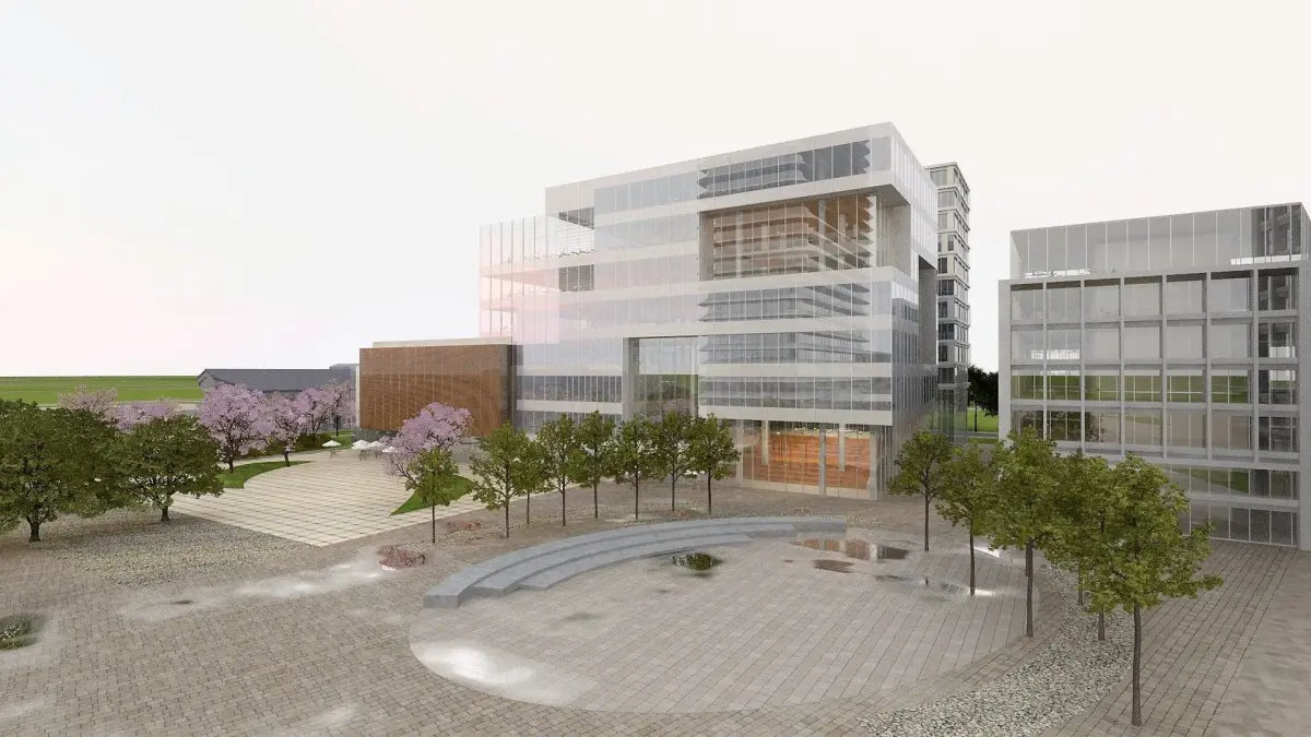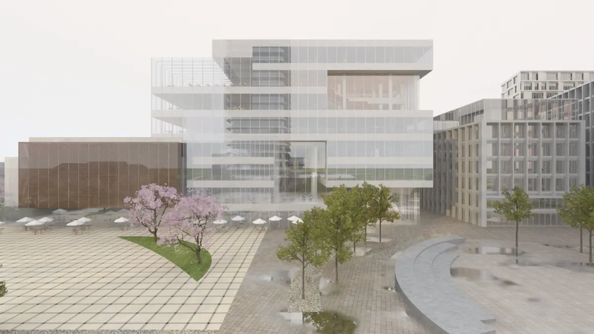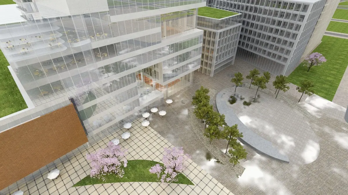 Business city block with simple interiors. Trees and furniture are vrmesh (16 files).