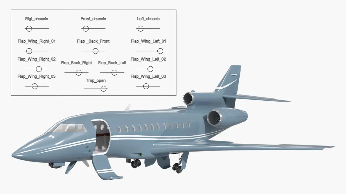 Business Jet Dassault 900 Simplified Rigged is fully rigged and is ready to be animated. You can easily position it the way you need or animate it the way your project requires using helpers in 3D Studio Max. See the turntable to get an idea of how rigging works.
