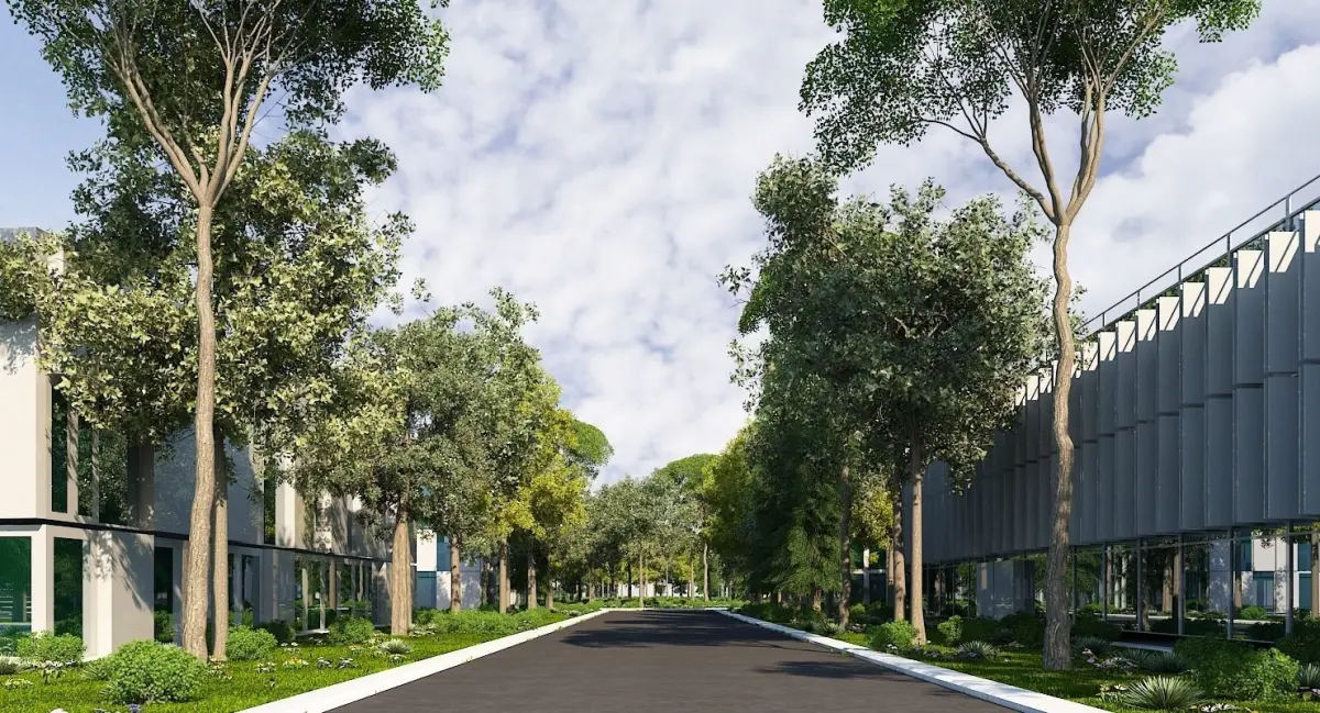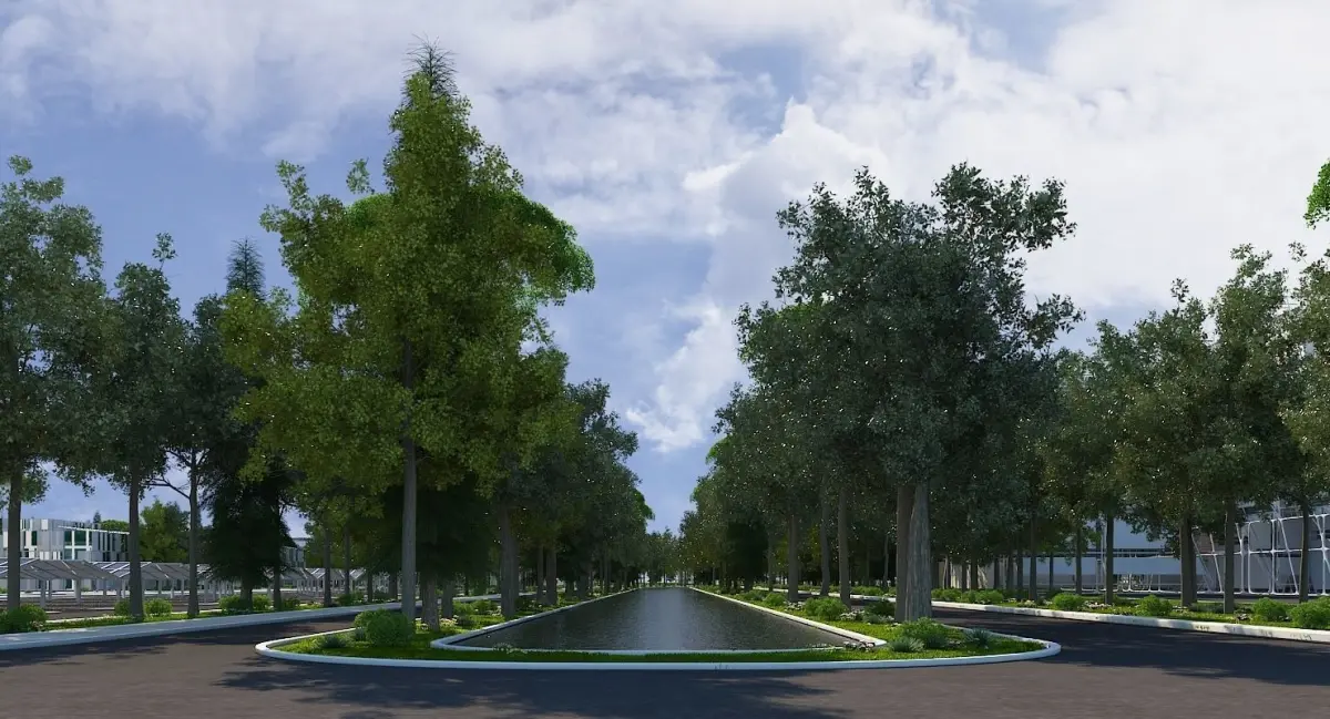 Trees and shrubs are scattered using Pflow in 3dsMax.