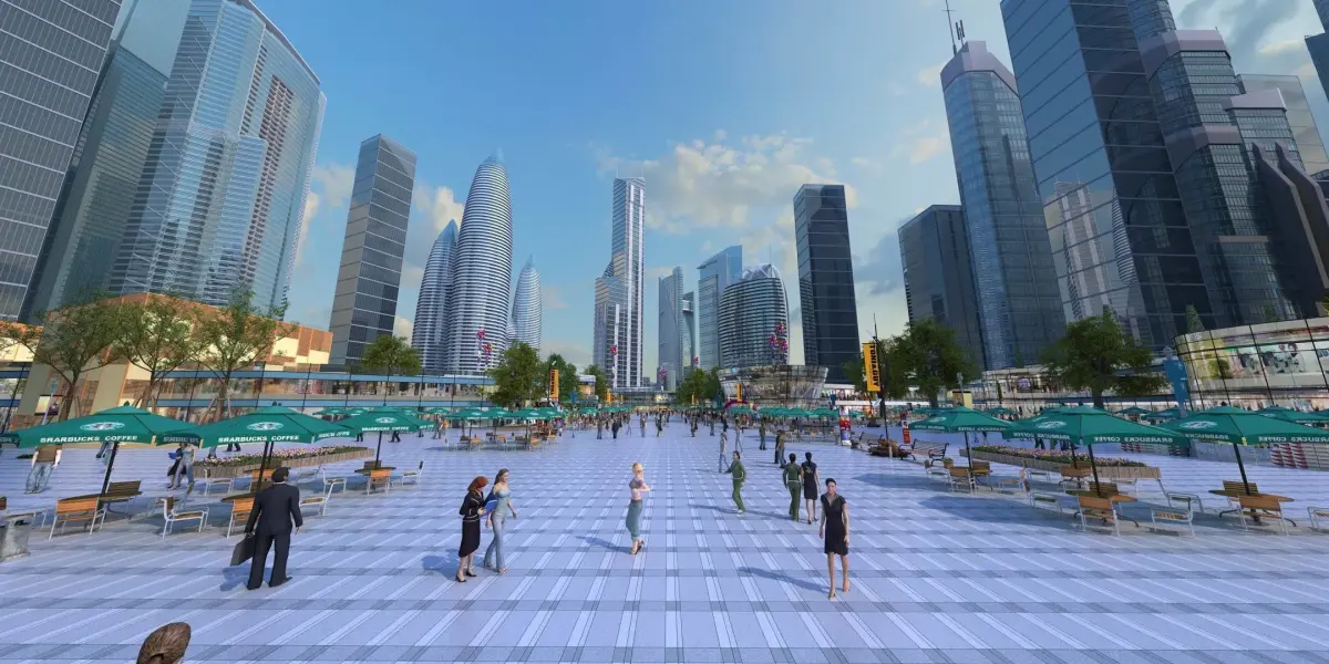 This is an architectural animation scene created by MAX2014 and rendered using V-Ray 4.10. The scene is very rich, including various urban buildings, plants, commercial props, animated characters, and more. The lighting has been tested, texture mapping is completed, and it is ready for direct rendering. The FBX and OBJ models only include the architectural structures and terrain.