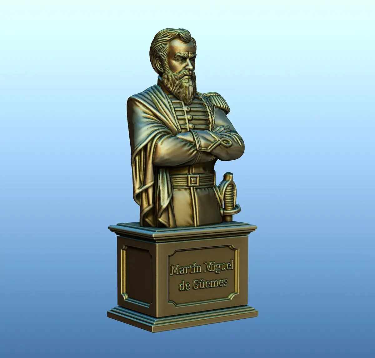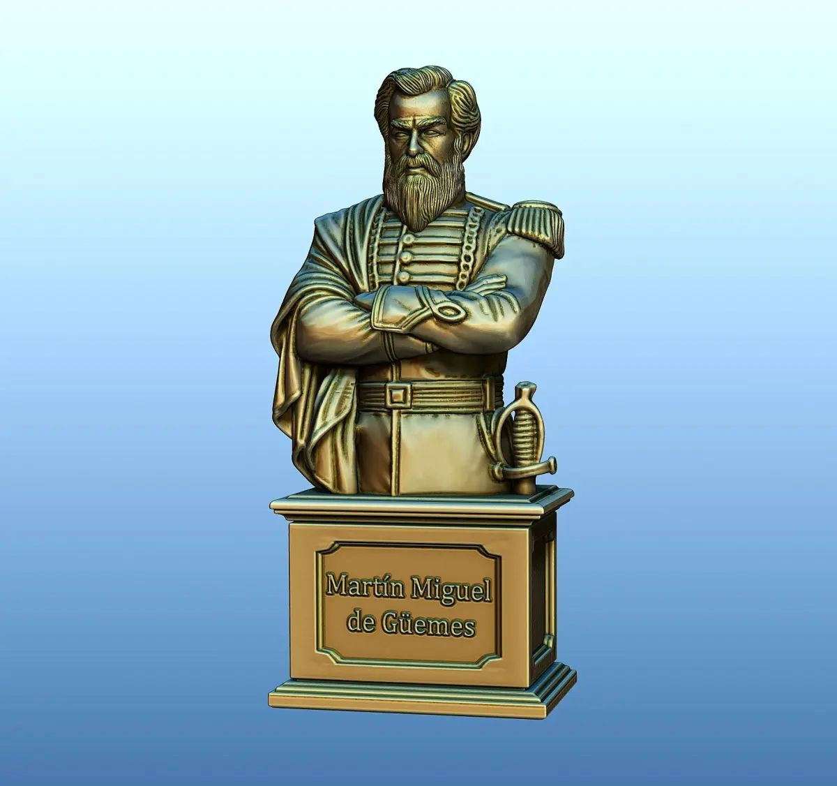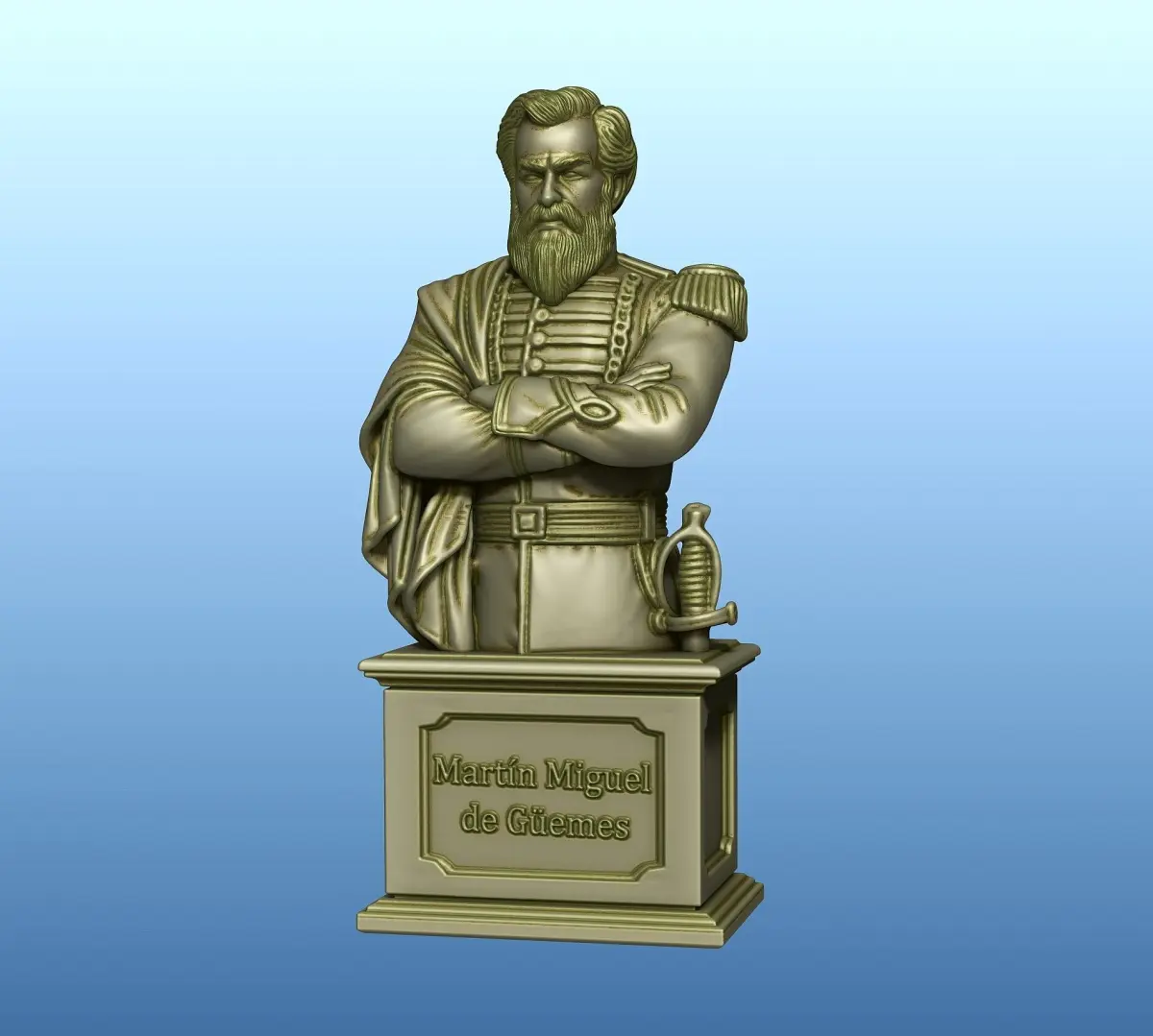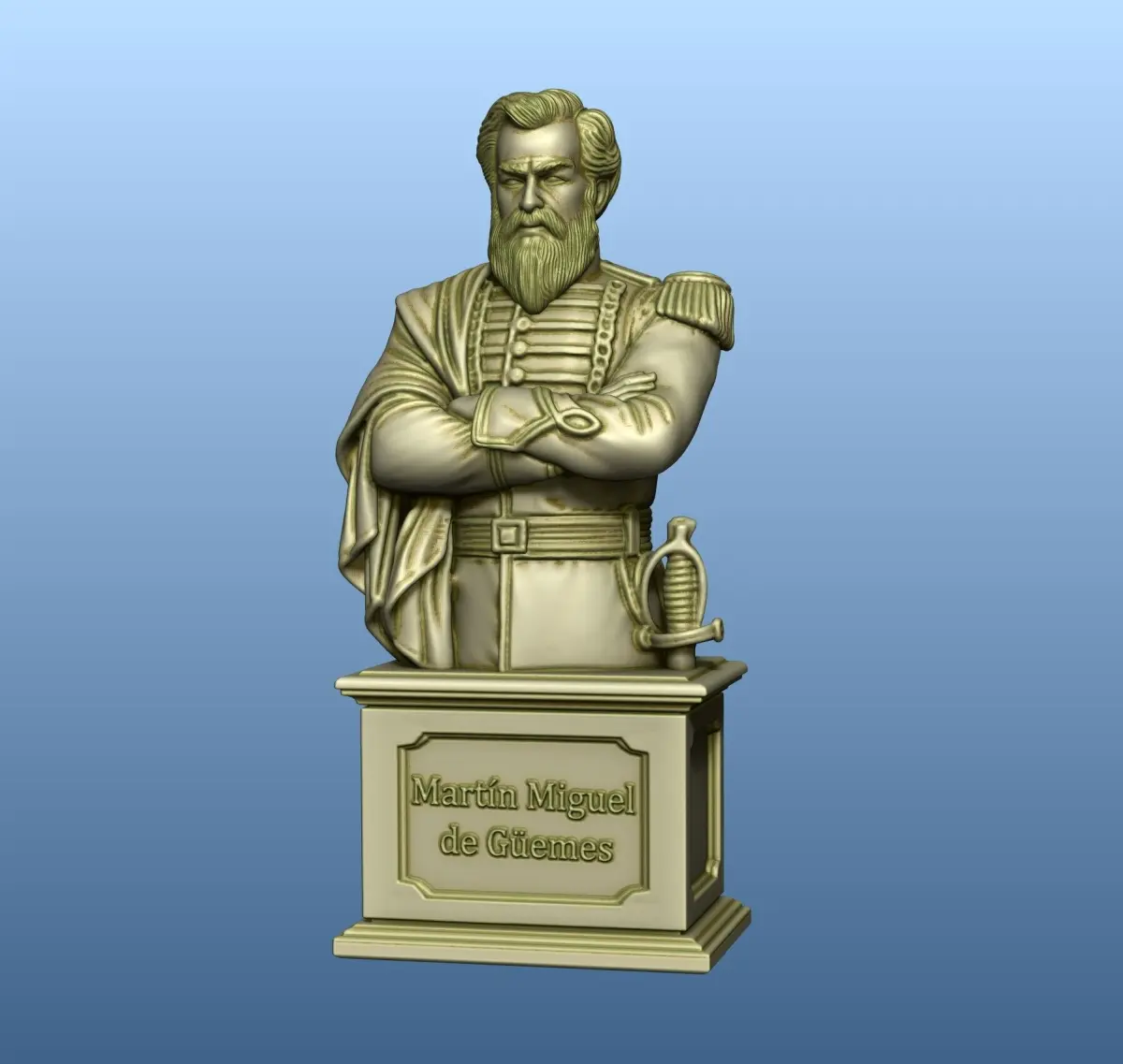 Design Concept:The bust represents Martín Miguel de Güemes, an important historical figure known for his military leadership in Northern Argentina. It features intricate details inspired by classical sculpture techniques, reflecting stature and dignity.Purpose:This bust is intended as a decorative piece, ideal for historians, educators, or enthusiasts interested in the history of Argentina and Salta. It can also serve as a conversation piece in various educational or cultural settings.Printing RecommendationsTo preserve fine details, high-resolution 3D printing is recommended. Using a resin printer allows for better capture of small details while ensuring orientation, minimizing the need for support structures.Assembly Instructions:The bust is designed as a single piece for easy printing, with no subsequent assembly required. After printing, light sanding and optional painting can enhance its appearance.
