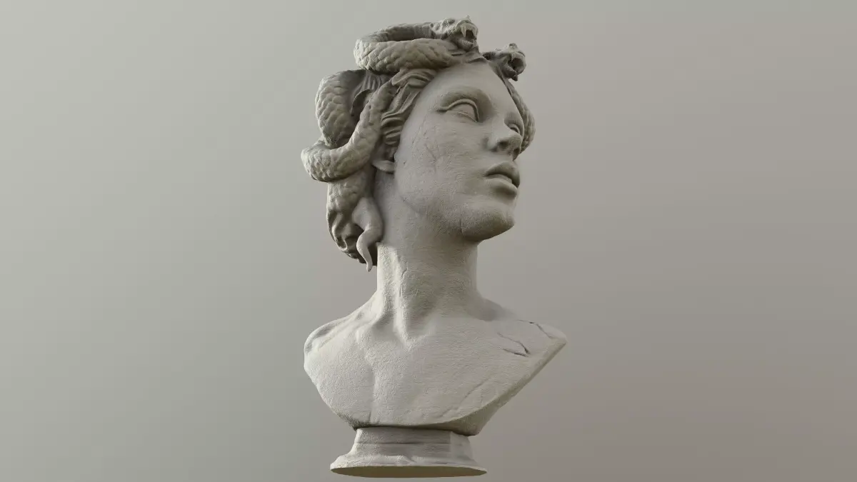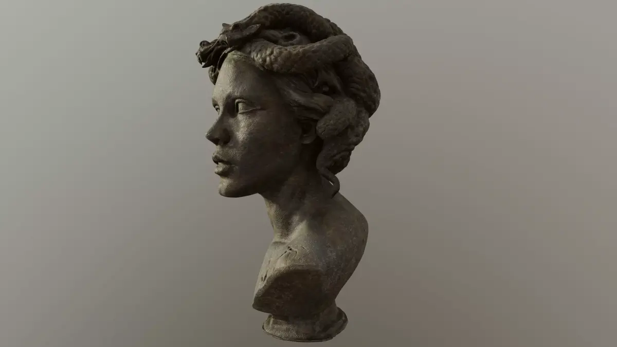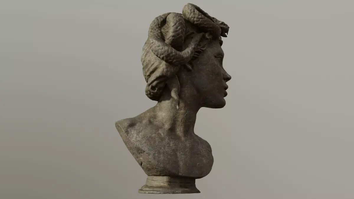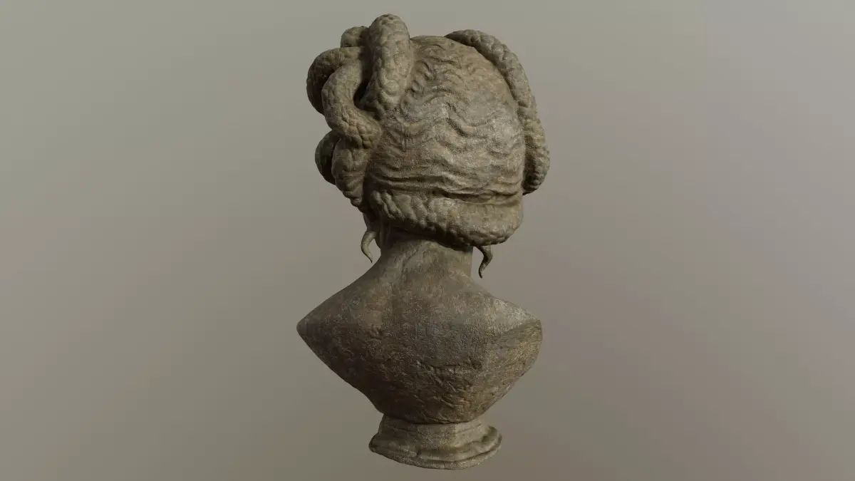 This 3D model features a beautifully sculpted stone bust inspired by the mythological figure Medusa, with intricately carved serpents entwined through her hair and a calm yet haunting expression. The statue includes detailed surface cracks, aged stone texture, and carefully chiseled facial features, making it ideal for mythology-themed environments, fantasy worlds, gothic architecture, museums, ruins, cinematic sequences, and hero prop placements.