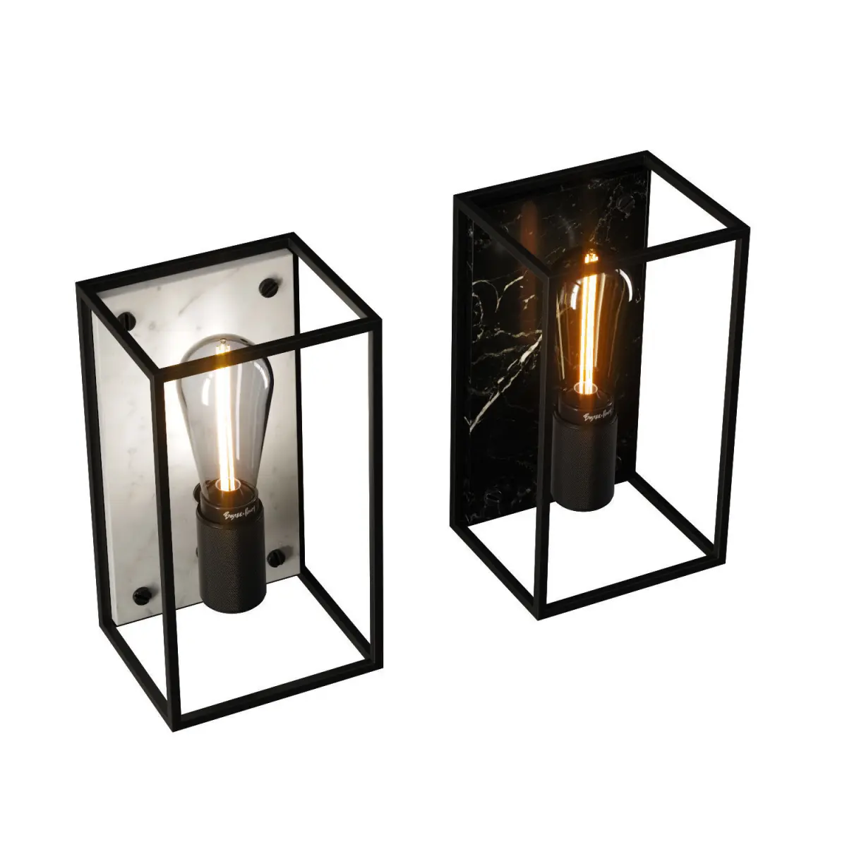 A Wall light made from a matt black metal cage and comes with a polished white andblack marble back panel.The dimensions are: W 170mm, H 299mm, D 176mm