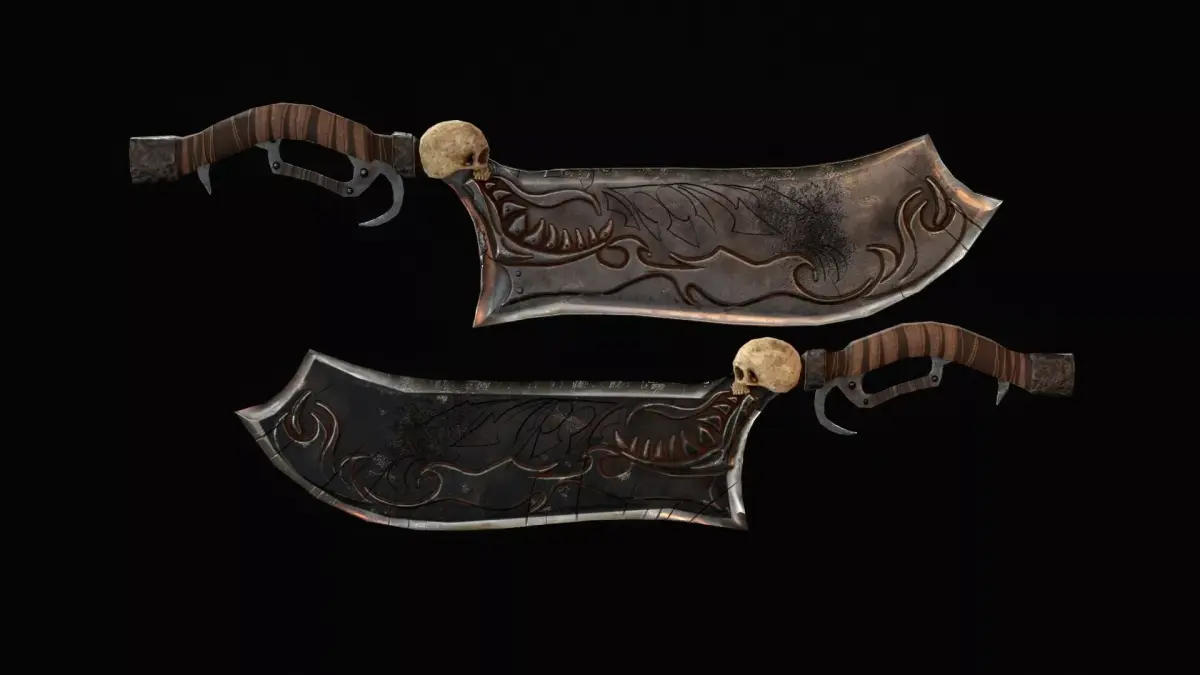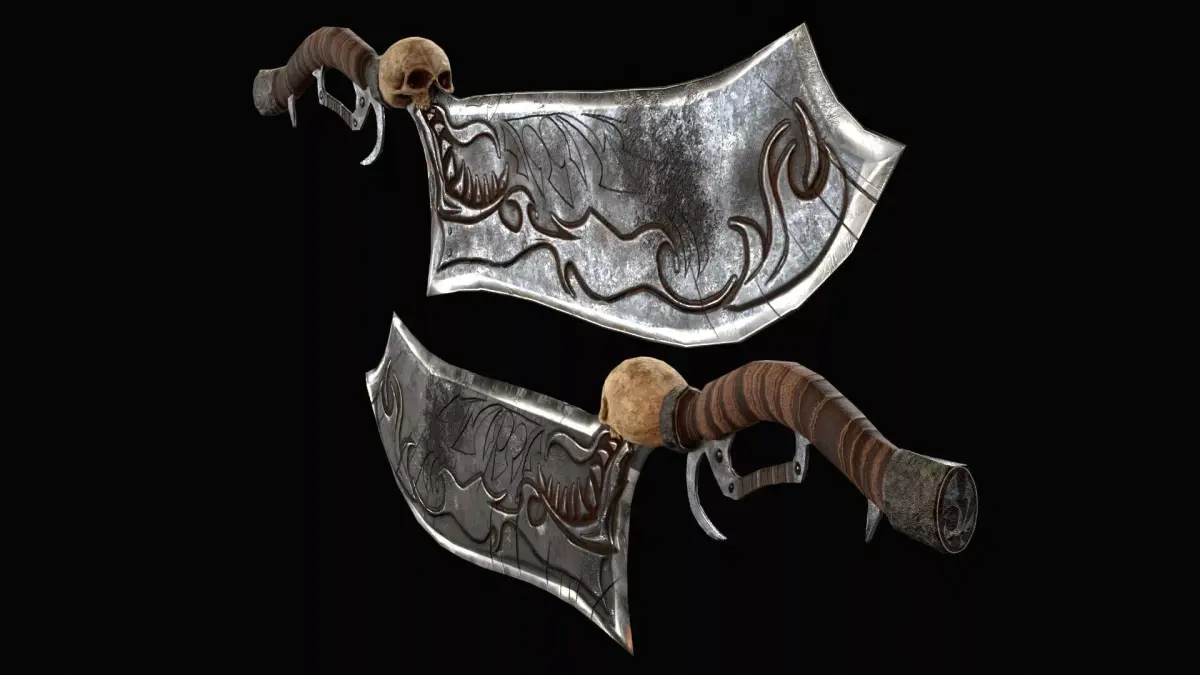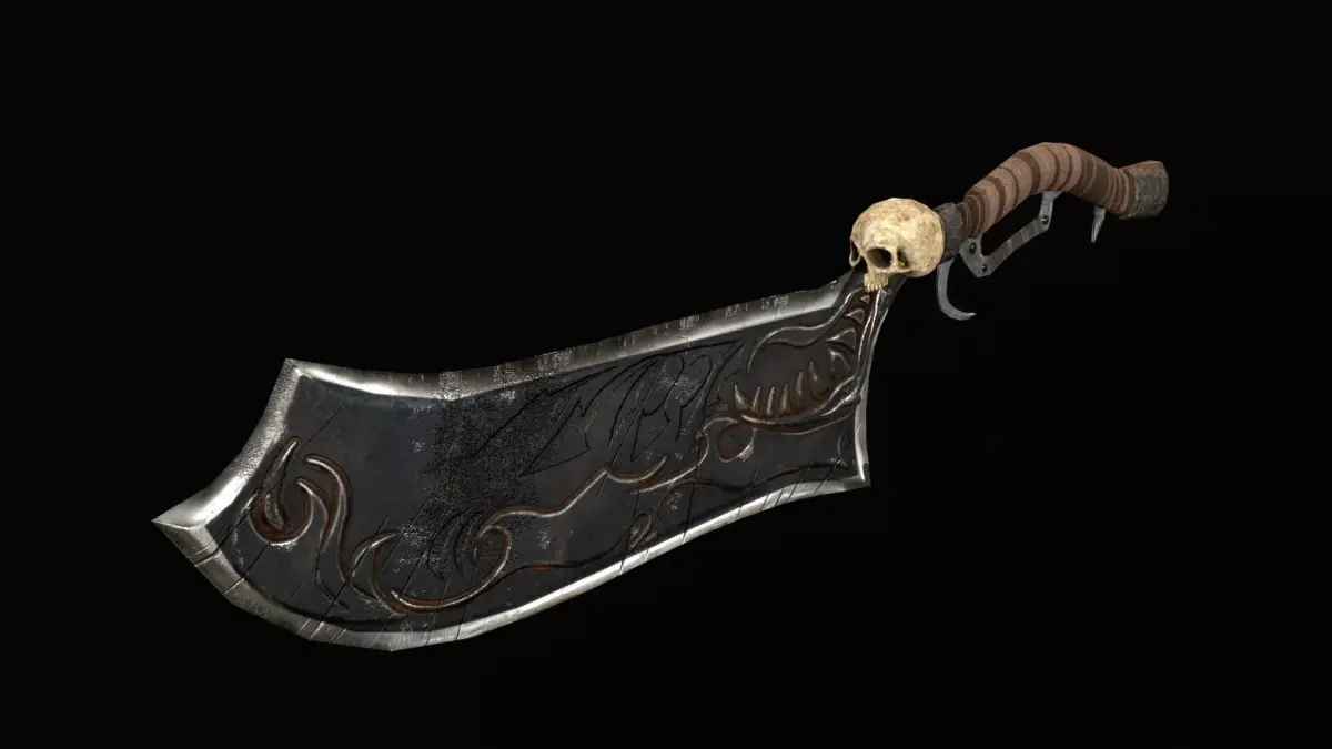 The design features a massive cleaver blade combined with a sinister skull on the guard, creating a menacing and memorable silhouette. The model includes PBR textures and is prepared for easy integration into game engines. The grip is positioned at world zero for convenient placement and attachment, and the model is oriented along the Z axis. The asset includes 2K and 4K textures, making it suitable for optimized real-time use as well as more detailed cinematic scenes.