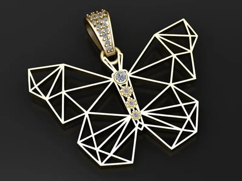 The pendants showcase a modern, geometric interpretation of a butterfly, characteOne pendant is presented in a lustrous gold tone, while the other is in a sleek silver tone. Both feature small, sparkling stones, likely diamonds or cubic zirconia, embedded in the bail (the loop for the chain) and along the central body of the butterfly, adding a touch of elegance. rized by sharp angles and interconnected lines that form the wings and body, reminiscent of an origami style.