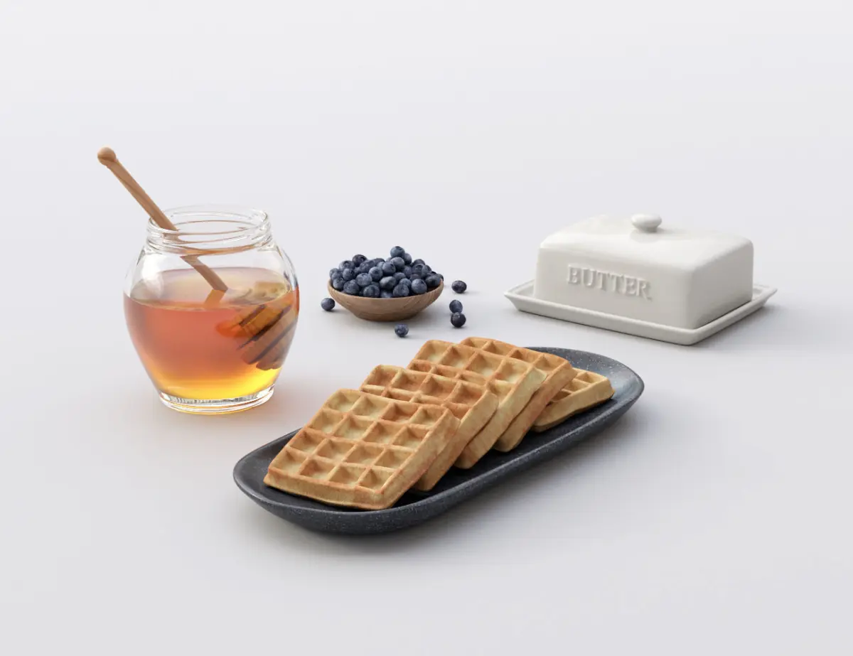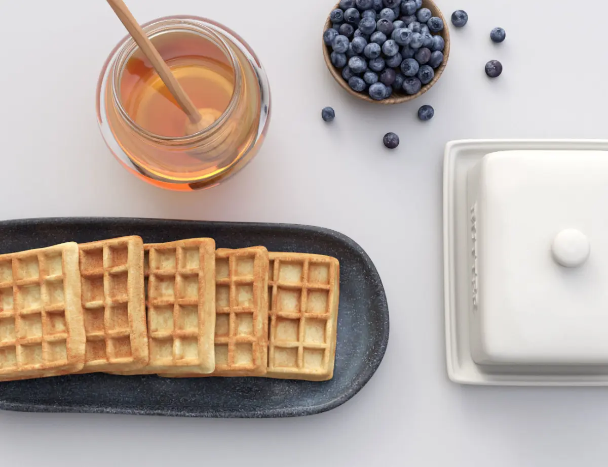 - 4 unique textured waffles on a handmade platter