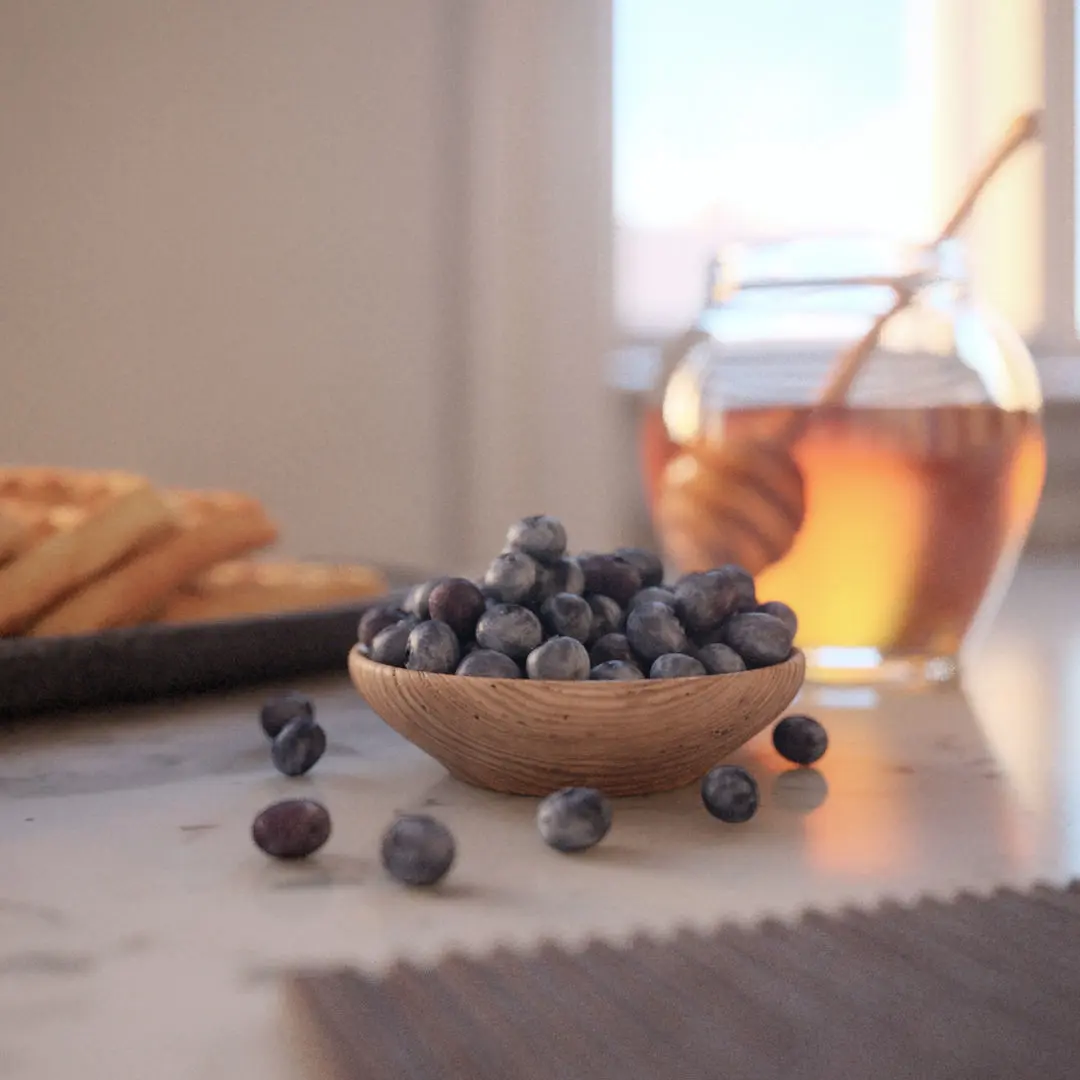 - woodbowl with 4 unique textured blueberries